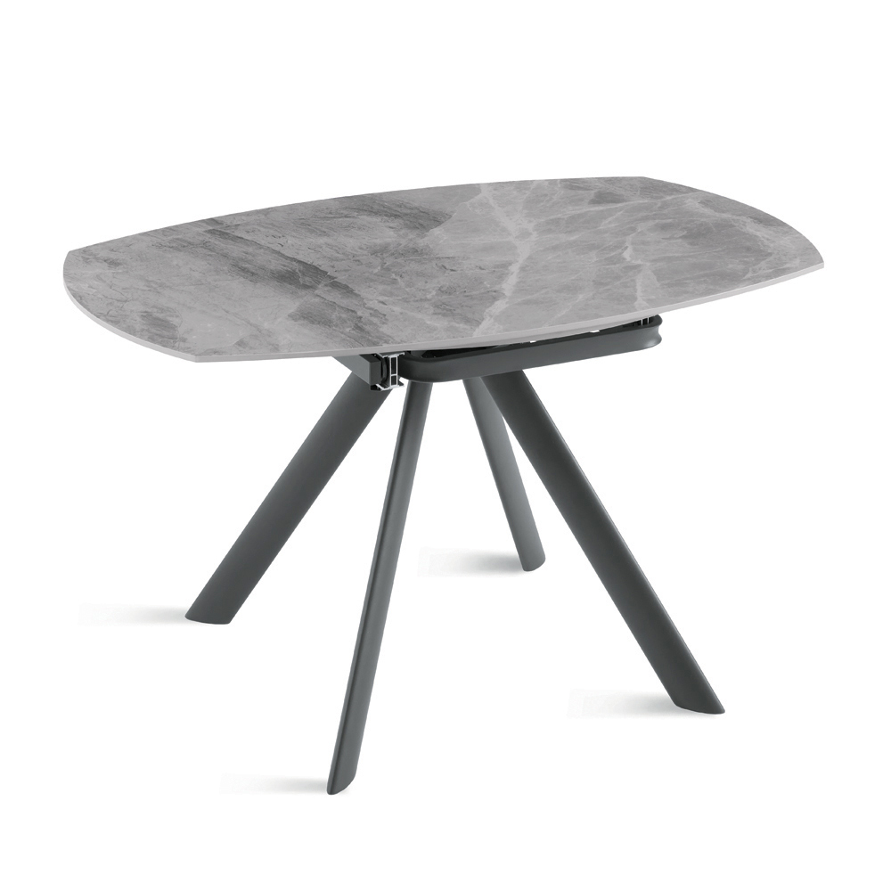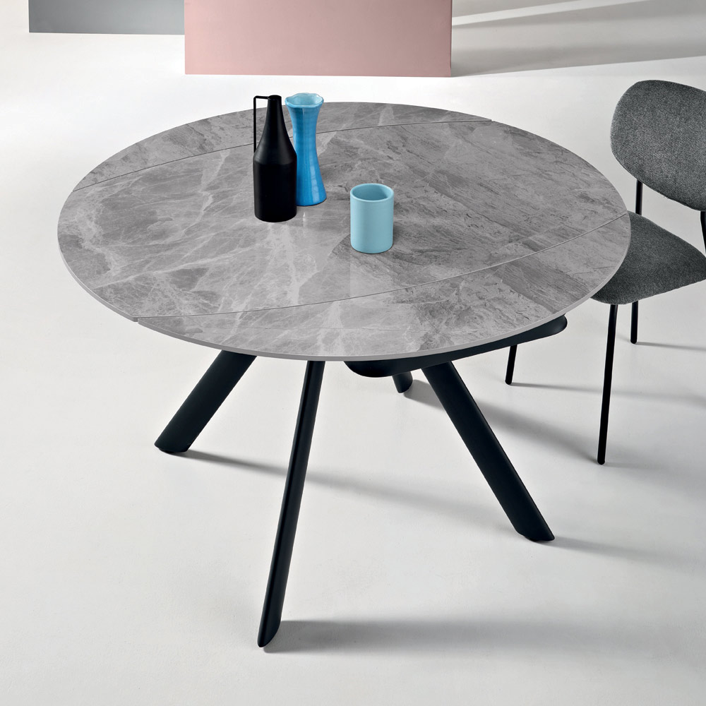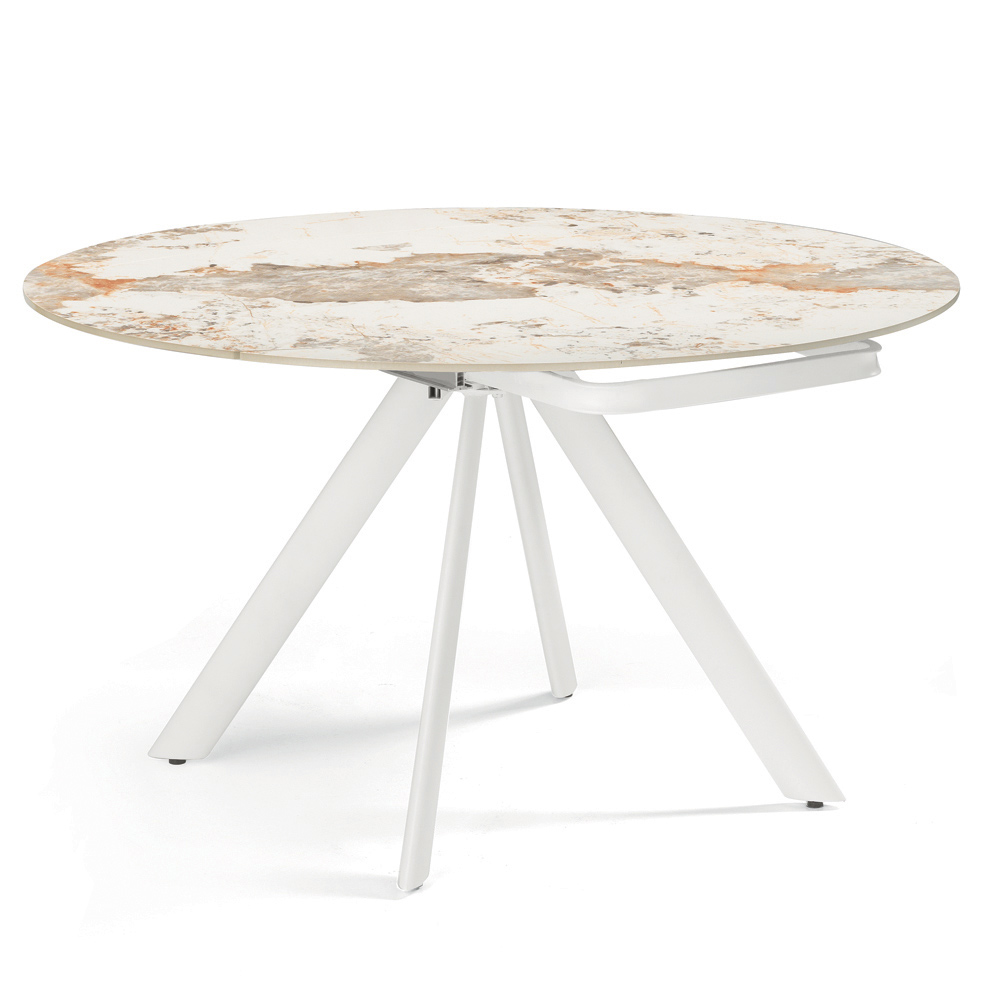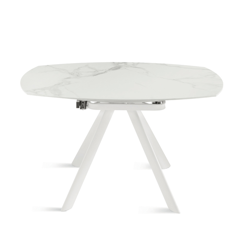 Elegante mesa de jantar extensível, projetada para mobiliar com estilo sua sala de estar ou sala de jantar . O tampo em pedra sinterizada com efeito mármore oferece uma superfície durável, refinada e fácil de limpar, perfeita para o uso diário.