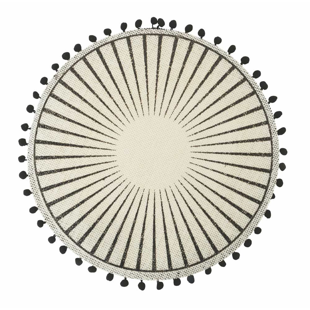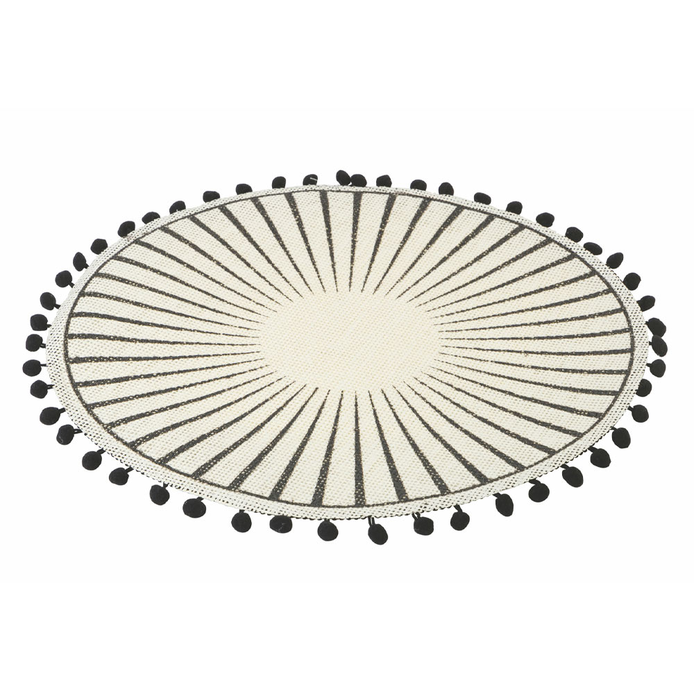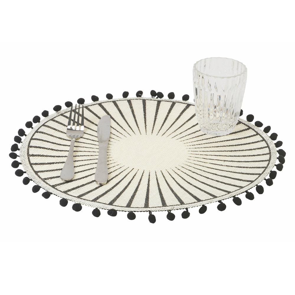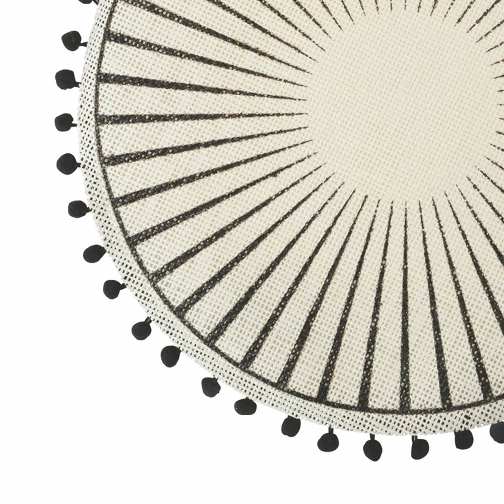 Jogo americano redondo de juta branca decorado com pompons pretos de 12 peças.