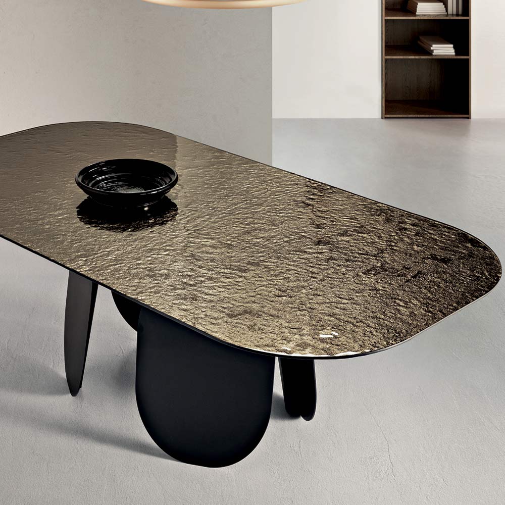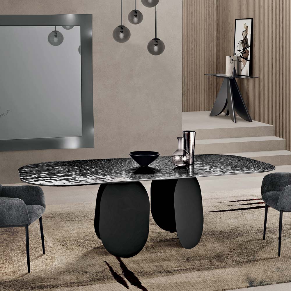 O tampo de vidro martelado com revestimento prateado na parte de trás adiciona brilho e profundidade visual graças à sua superfície texturizada que reflete a luz com efeitos iridescentes. Os cantos arredondados do tampo suavizam o perfil da mesa, tornando-a mais acolhedora e perfeita para momentos de convívio.