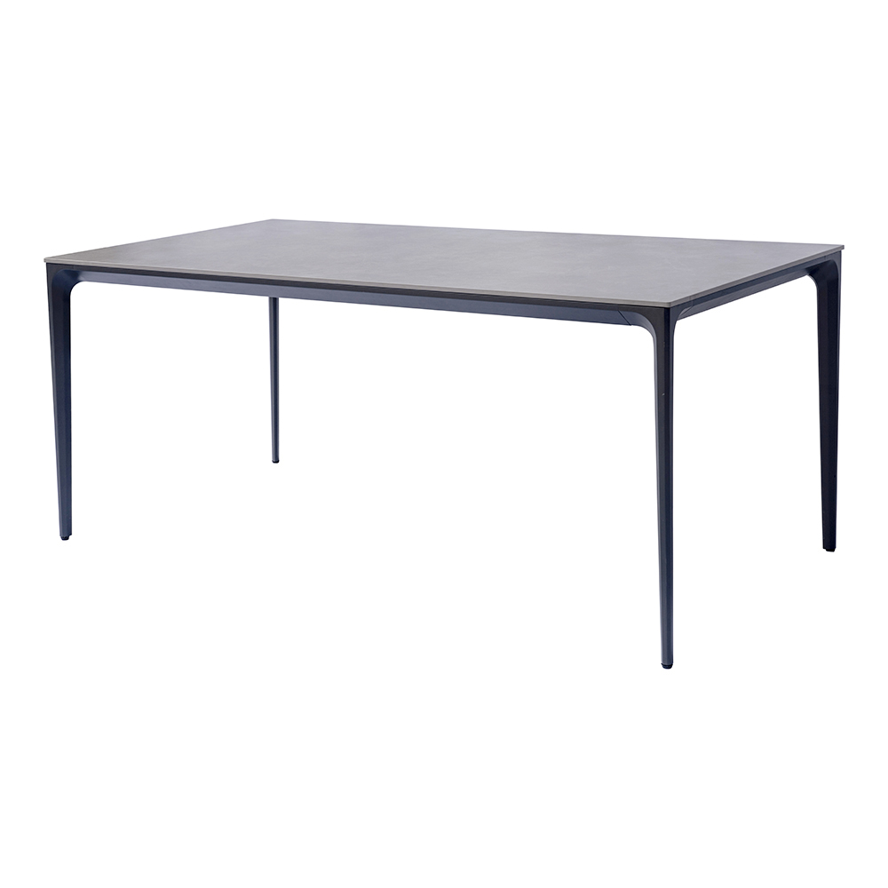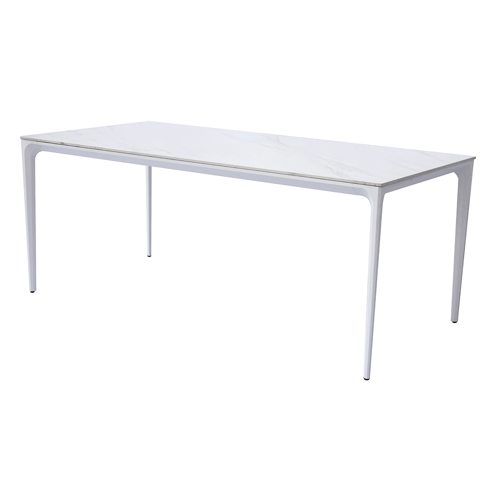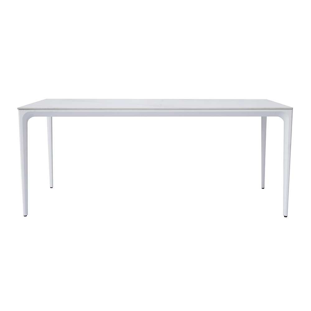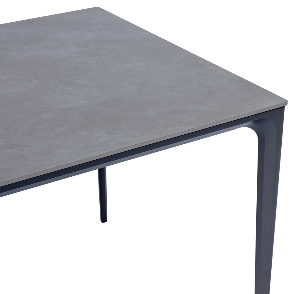 O tampo em grés com efeito pedra oferece um visual elegante e natural, evocando as texturas autênticas dos materiais pétreos, mas com toda a praticidade de uma superfície durável e fácil de limpar. A estrutura fina e linear em alumínio confere leveza visual, garantindo estabilidade e solidez ao longo do tempo.