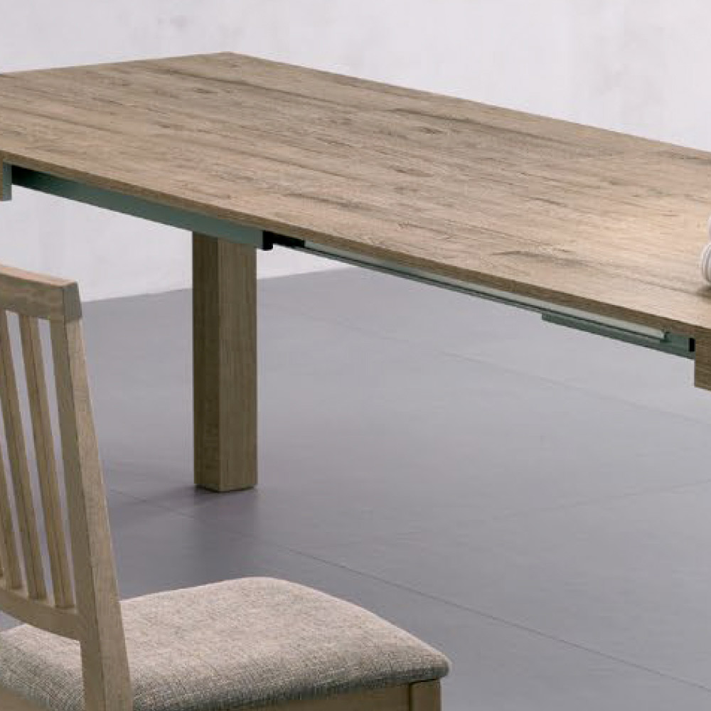 Mesa retangular extensível com tampo laminado. Acabamento dobrável com 80 mm de espessura.