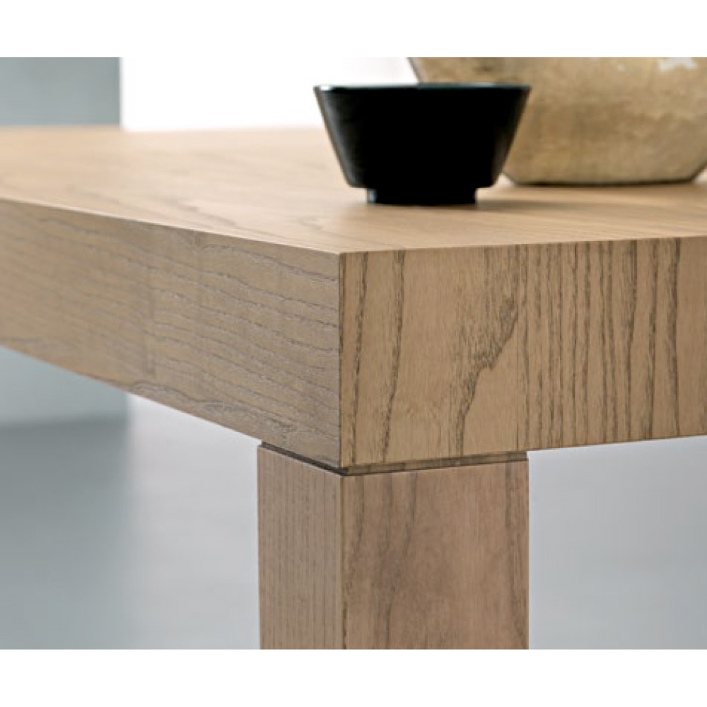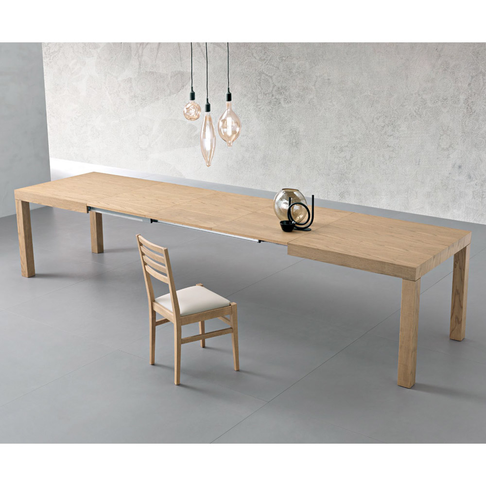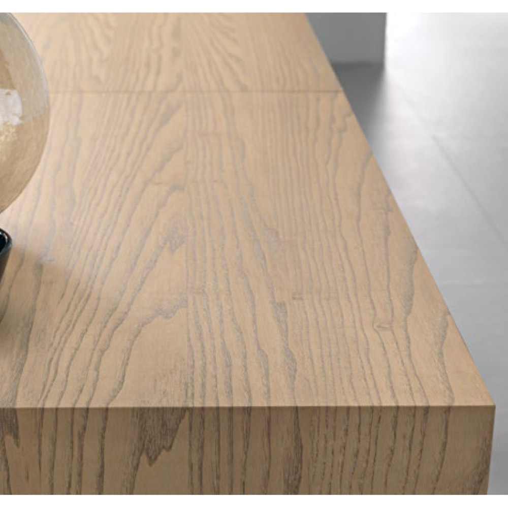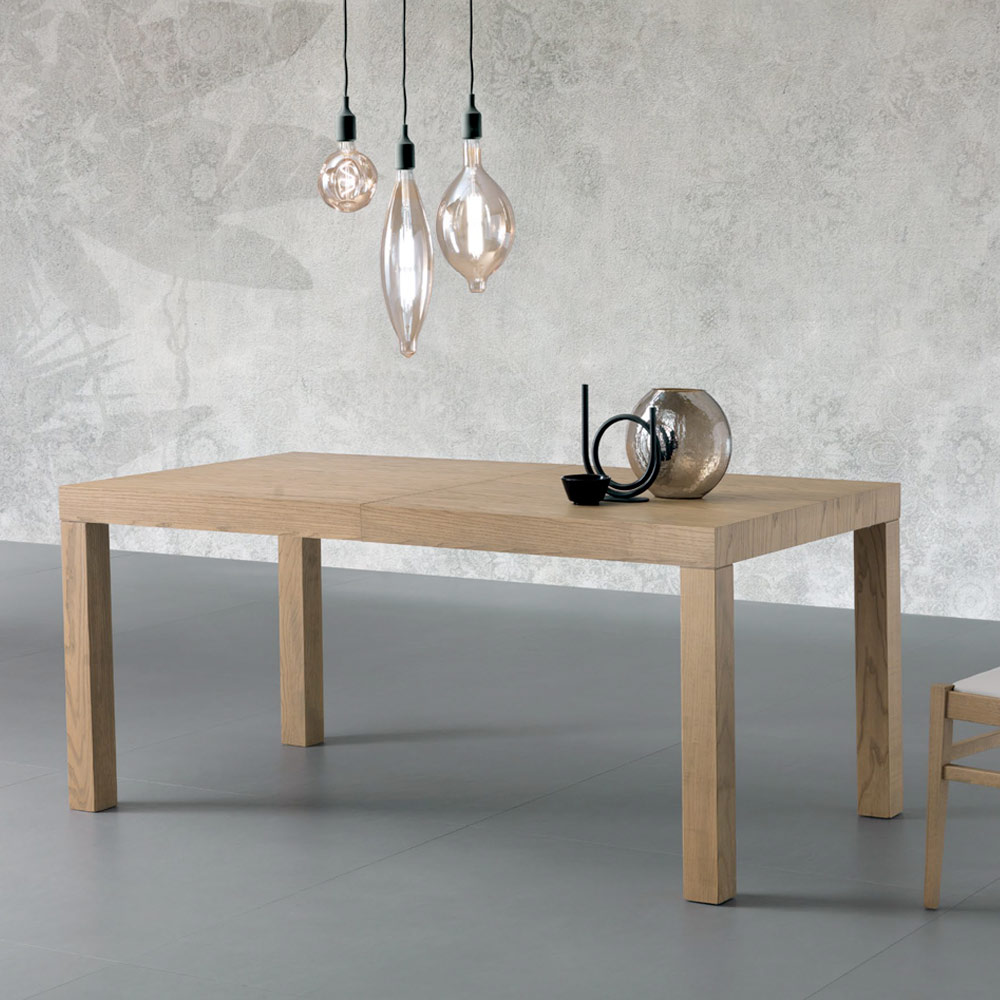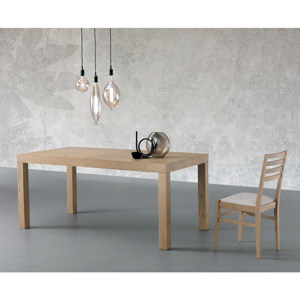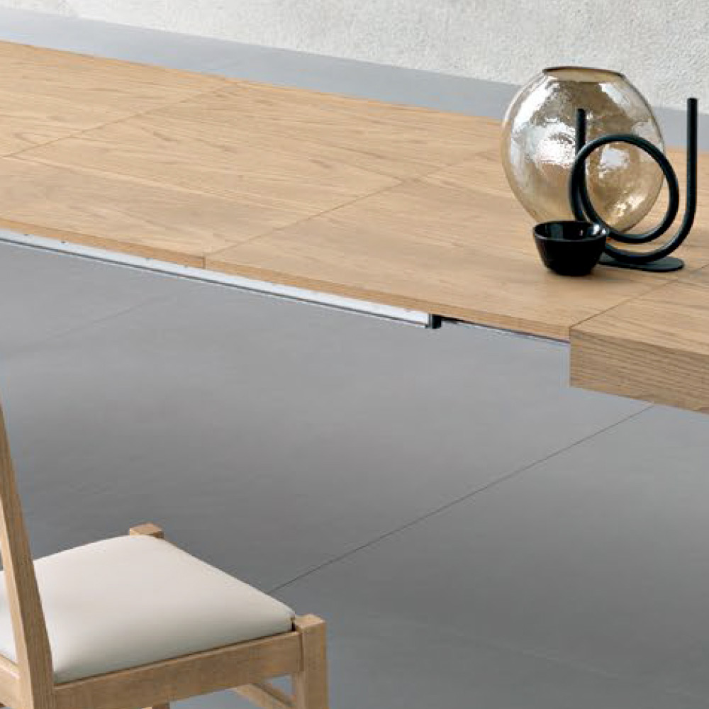 Mesa retangular extensível com tampo folheado a freixo. 80 mm de espessura, acabamento dobrável.