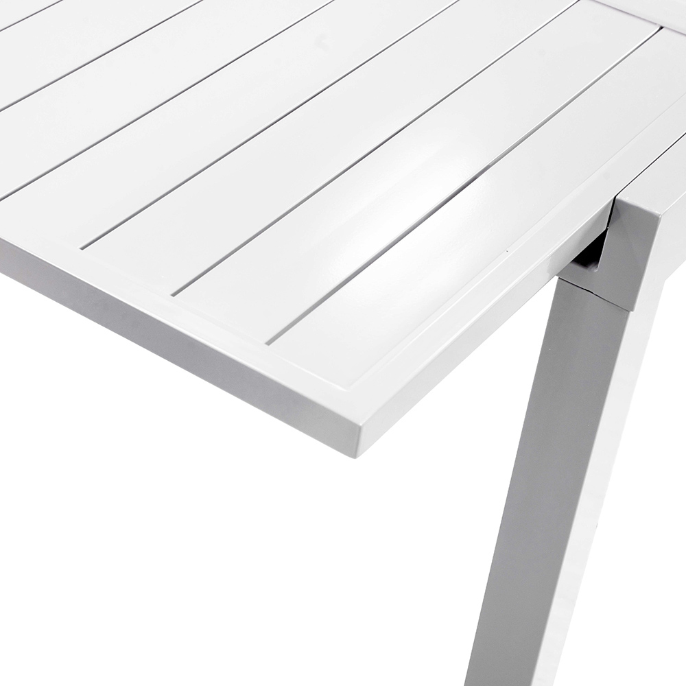 Esta mesa extensível de alumínio apresenta um design limpo e moderno, ideal para quem procura uma solução versátil e durável para espaços ao ar livre. Esta mesa não só oferece uma superfície resistente e fácil de limpar, mas também uma estética que se encaixa perfeitamente com qualquer estilo de mobiliário de exterior.