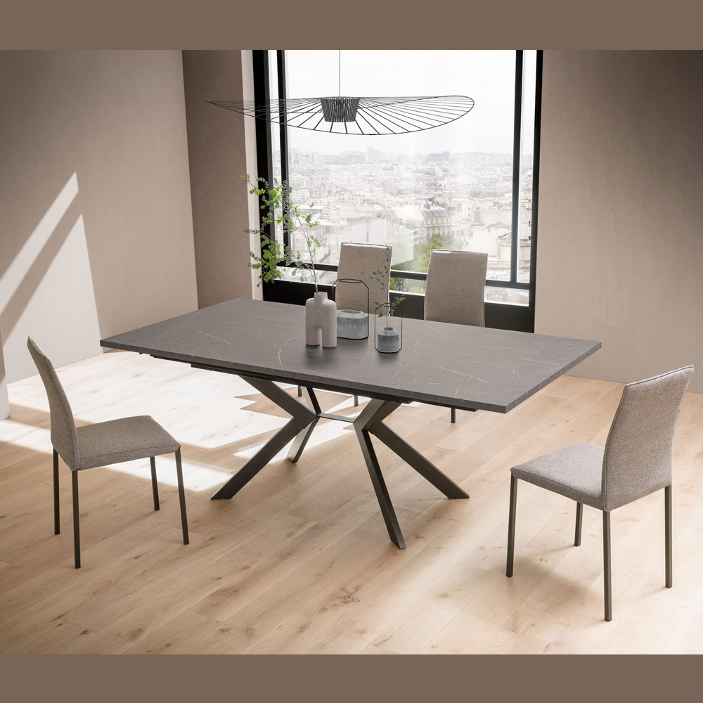 A base, em metal pintado e com um desenho geométrico cruzado, oferece estabilidade e um toque escultural que não passa despercebido. Uma solução de mobiliário perfeita para salas de jantar, espaços abertos ou ambientes corporativos com um estilo refinado.