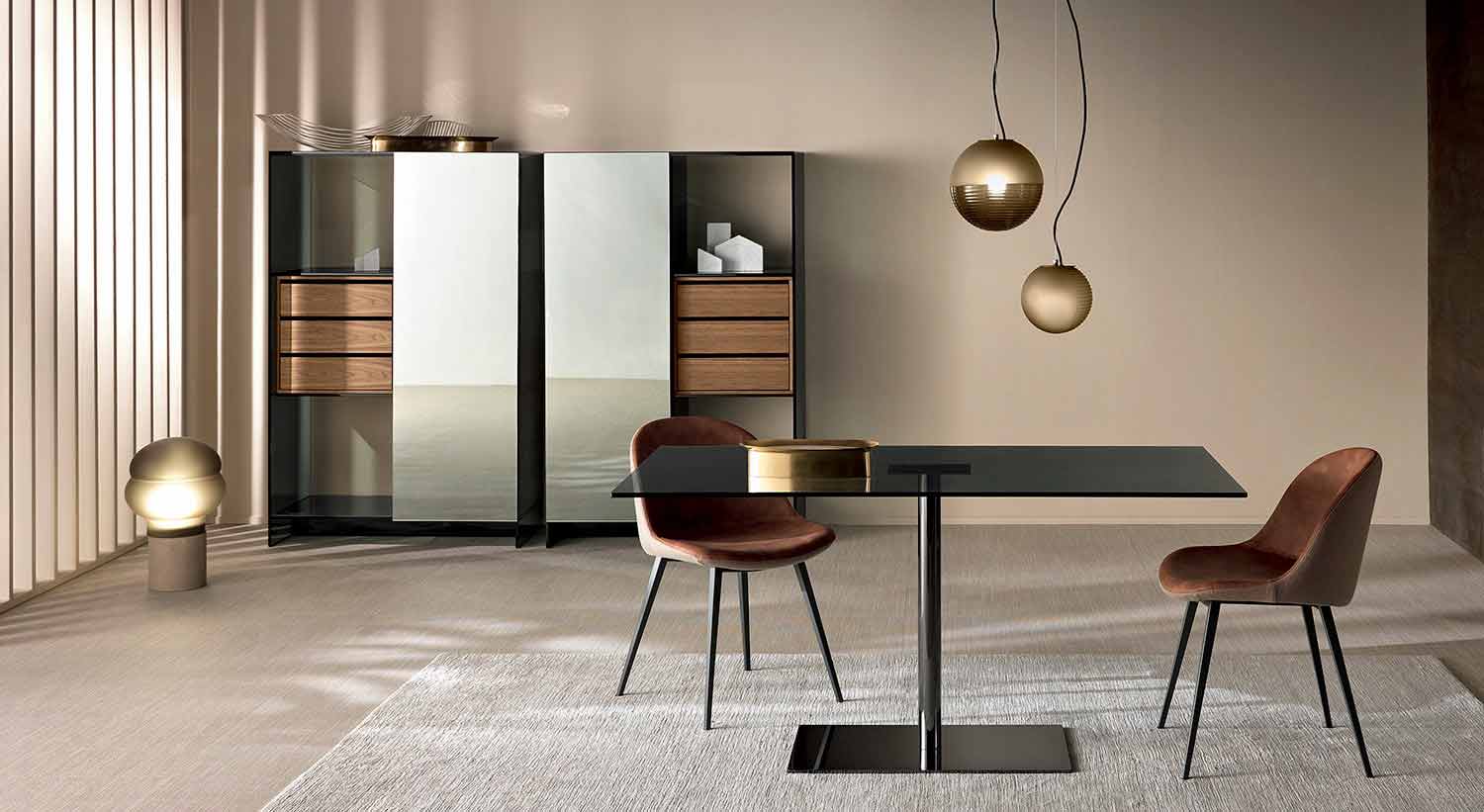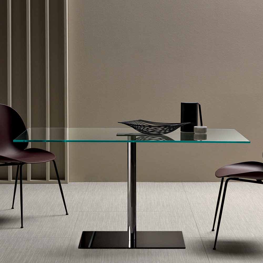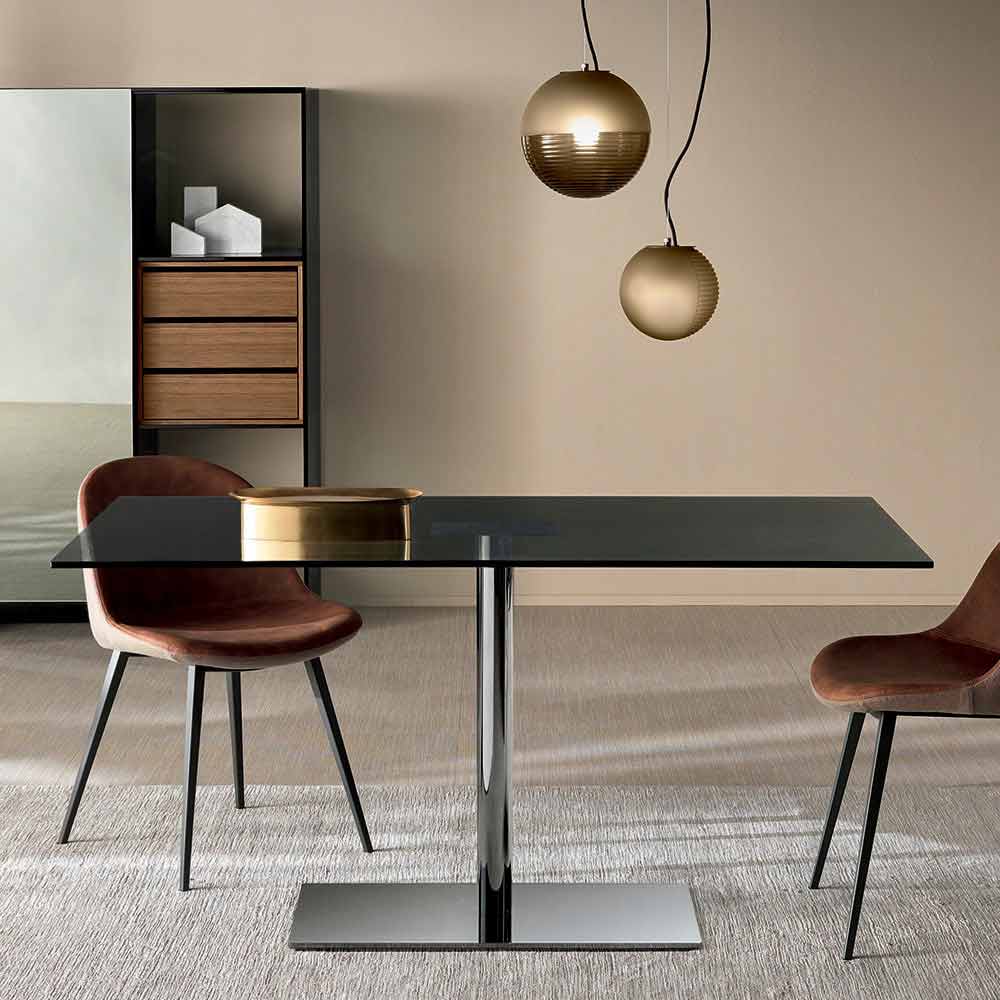 Mesa de jantar retangular de luxo com tampo de vidro extra claro ou defumado e base de metal, fabricada na Itália.