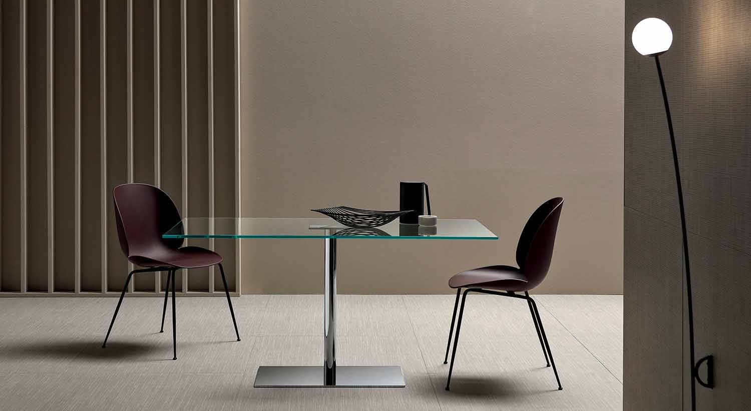 - tampo de vidro extra-claro, base de metal cromado.
