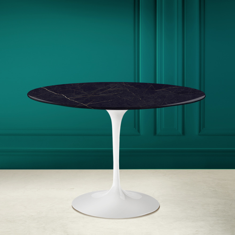Mesa de jantar redonda com tampo em cerâmica noir laurent, efeito mármore noir laurent mate, e base em alumínio polido inteiramente Made in Italy. Esta mesa combina funcionalidade e elegância graças aos materiais utilizados na sua construção. A cerâmica noir laurent tem