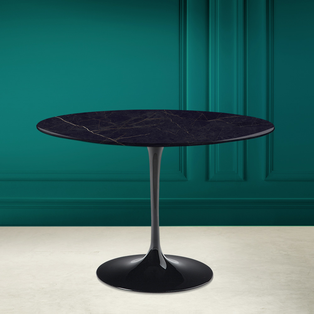 Mesa de jantar com tampo redondo em cerâmica noir laurent e base em alumínio polido Made in Italy