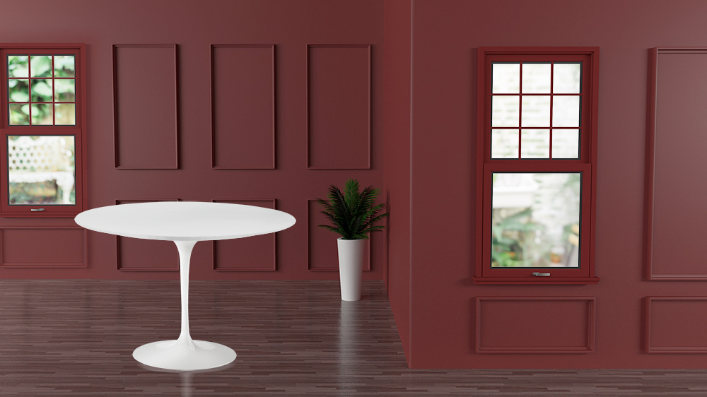 Mesa de jantar redonda com tampo em laminado líquido branco e base em alumínio polido branco Made in Italy