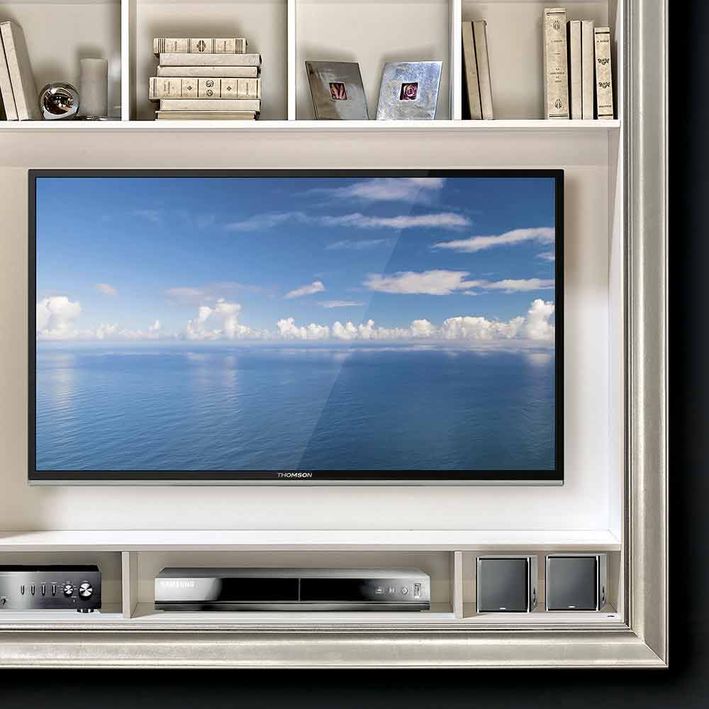 No interior da moldura encontra-se um compartimento para televisão colocado ao centro e ladeado por elegantes estantes que oferecem espaço para livros e objetos de decoração para personalizar e enriquecer o espaço. Abaixo, compartimentos discretos abrigam com estilo dispositivos multimídia, mantendo o ambiente arrumado e sem fios expostos.