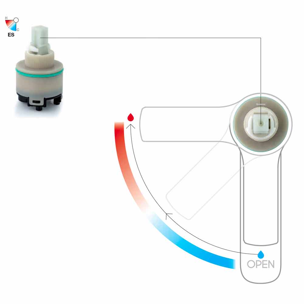 ES fornece água fria quando a alavanca é levantada na posição central evitando assim a solicitação de água quente para a caldeira permitindo uma consequente economia de energia.