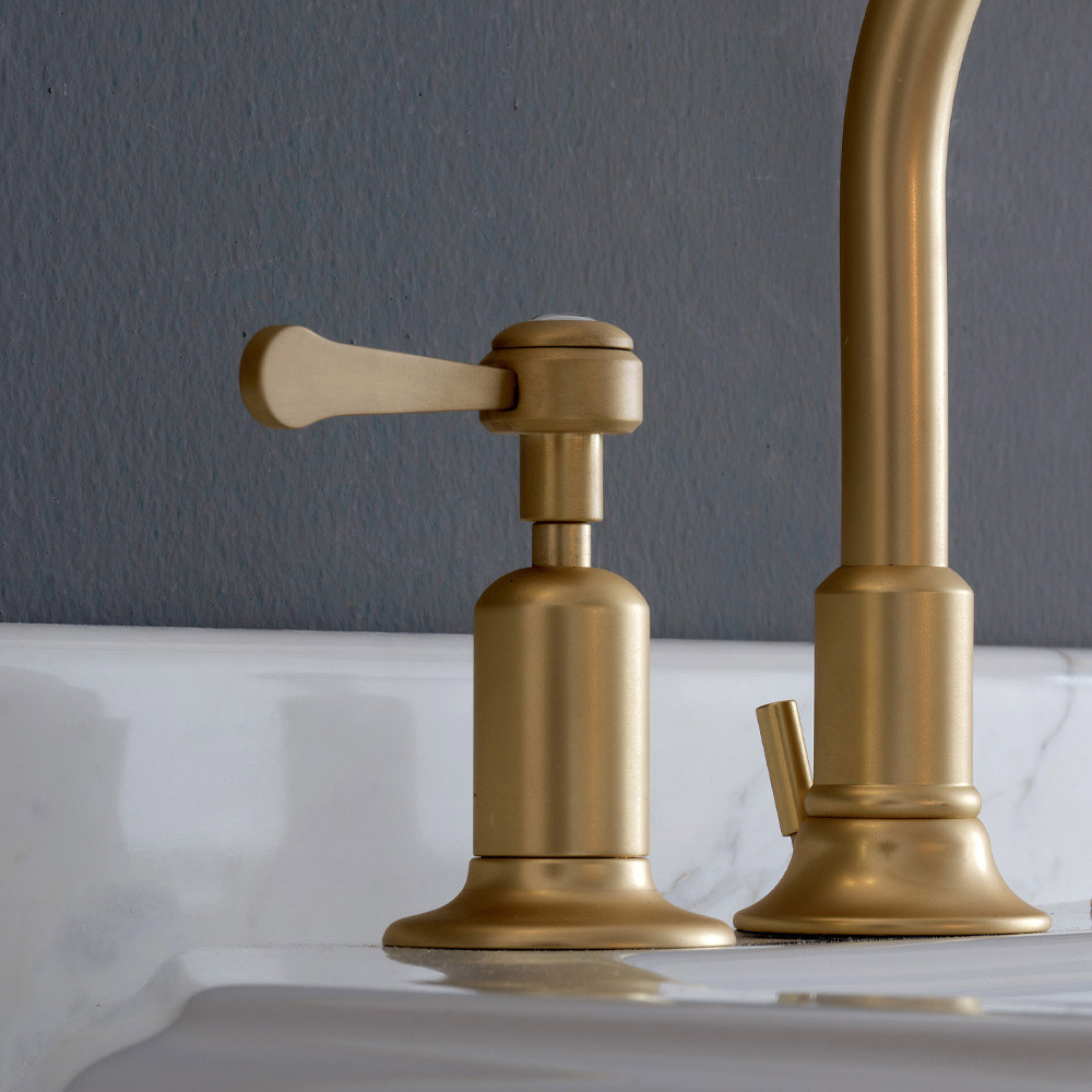 Esta requintada torneira de 3 furos de bica alta e com ralo é inteiramente fabricada artesanalmente por artesãos experientes na indústria a partir de latão pesado, fundido em moldes que respeitam os sistemas artesanais do passado e protegido com uma espessa camada superior de latão mate.