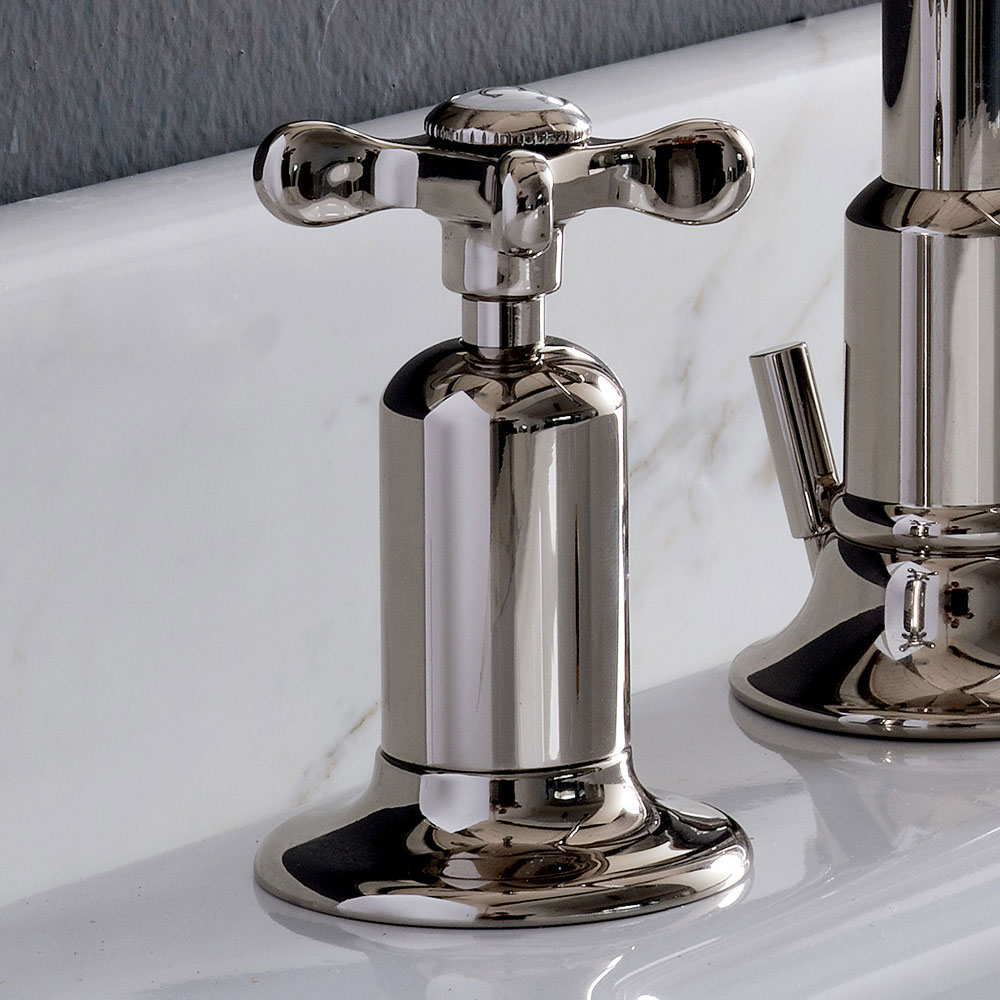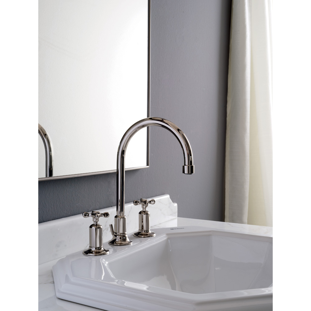 Esta requintada torneira de bica alta de 3 furos e com ralo é inteiramente fabricada artesanalmente por artesãos experientes no sector a partir de latão pesado, fundido em moldes que respeitam os sistemas artesanais do passado e protegido com uma espessa camada superior em níquel.