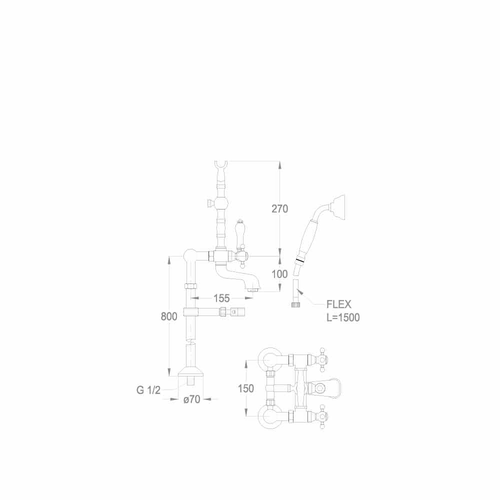 Misturador de banheira exposto em colunas de piso com desviador e chuveiro de mão duplex Fabricado na Itália.