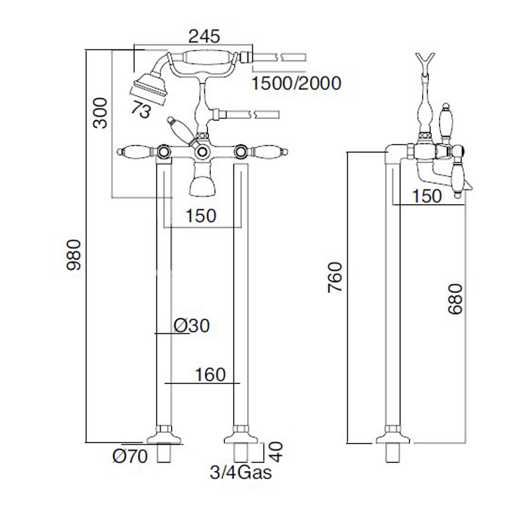 Torneira de chão para banheira com alavancas em estilo clássico, artigo de luxo fabricado na Itália.