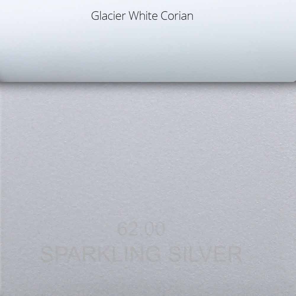 - Prata Espumante + Branco Glacier Corian®: acabamento metálico prata fosco com elementos DuPont ™ Corian® brancos;