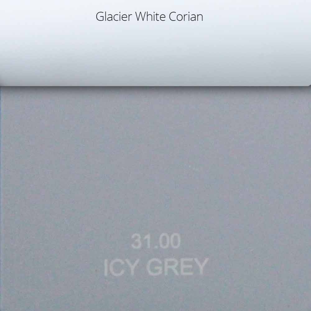 - Cinza Icy + Glacier White Corian®: acabamento em cinza claro frio mate com elementos DuPont ™ Corian® brancos;