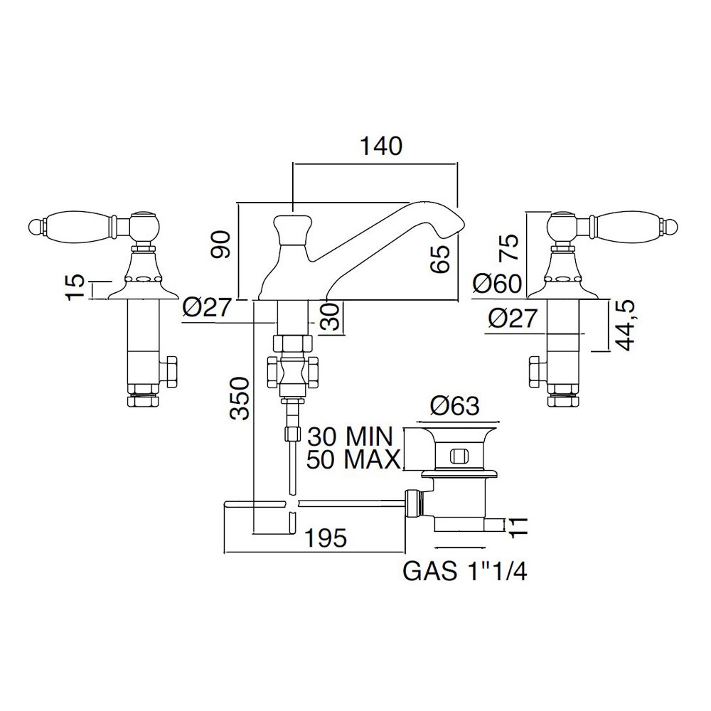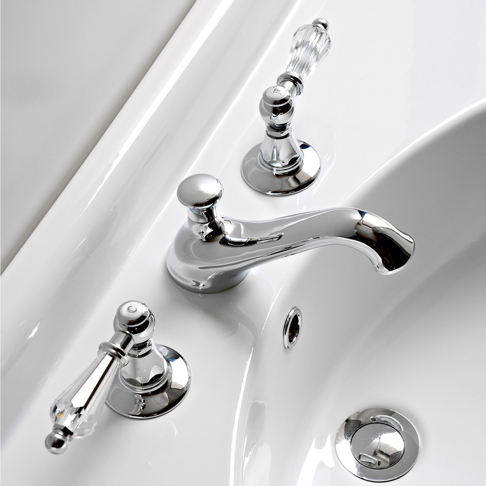 Torneira de lavatório de 3 furos com ralo estilo clássico em latão artesanal com alavancas, fabricada em Itália.
