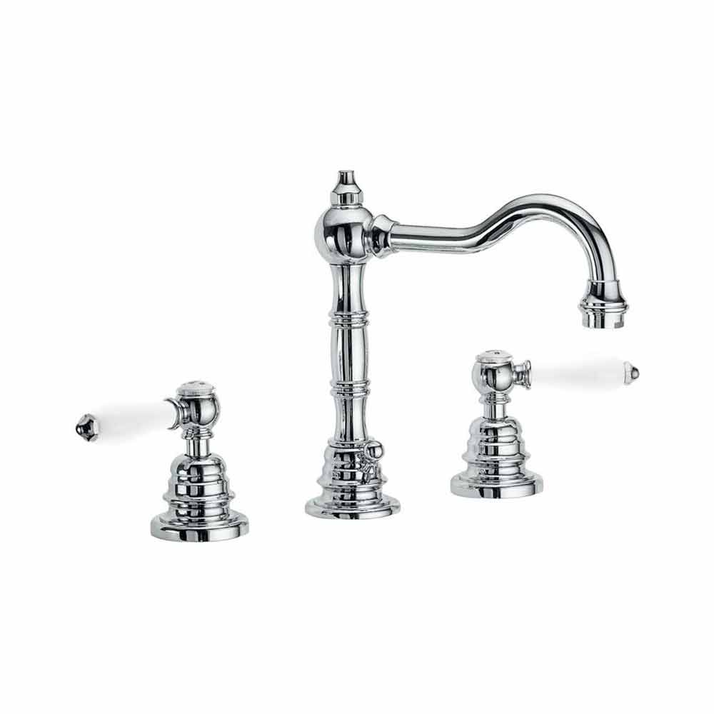Misturador para lavatório de bancada em latão com acabamento cromado com design extremamente clássico de 205 mm de altura e 170 mm de distância entre os centros, completo com ralo e alavanca pop-up.