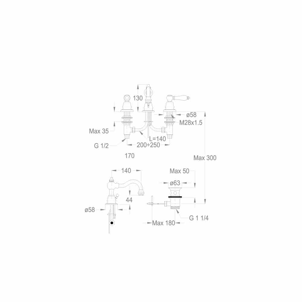 Misturador para lavatório de bancada com três furos em latão cromado com design clássico de 130 mm de altura e distância ao centro de 140 mm, completo com ralo e alavanca pop-up. Produzido inteiramente na Itália com materiais de alta qualidade em conformidade com os padrões europeus. Este misturador pode ser instalado na parte superior, equipado com arejador e cabeçote cerâmico 90 °; recomendado pelo seu sistema Energy Saving para economia de água de 6L / min e sua bica giratória.