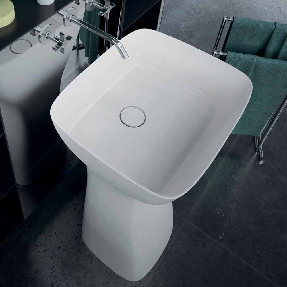 Firmino é uma maravilhosa pia autônoma de cerâmica feita na Itália com bordas extremamente finas e com formas rigorosas, perfeitas para fornecer ao seu banheiro design e funcionalidade.