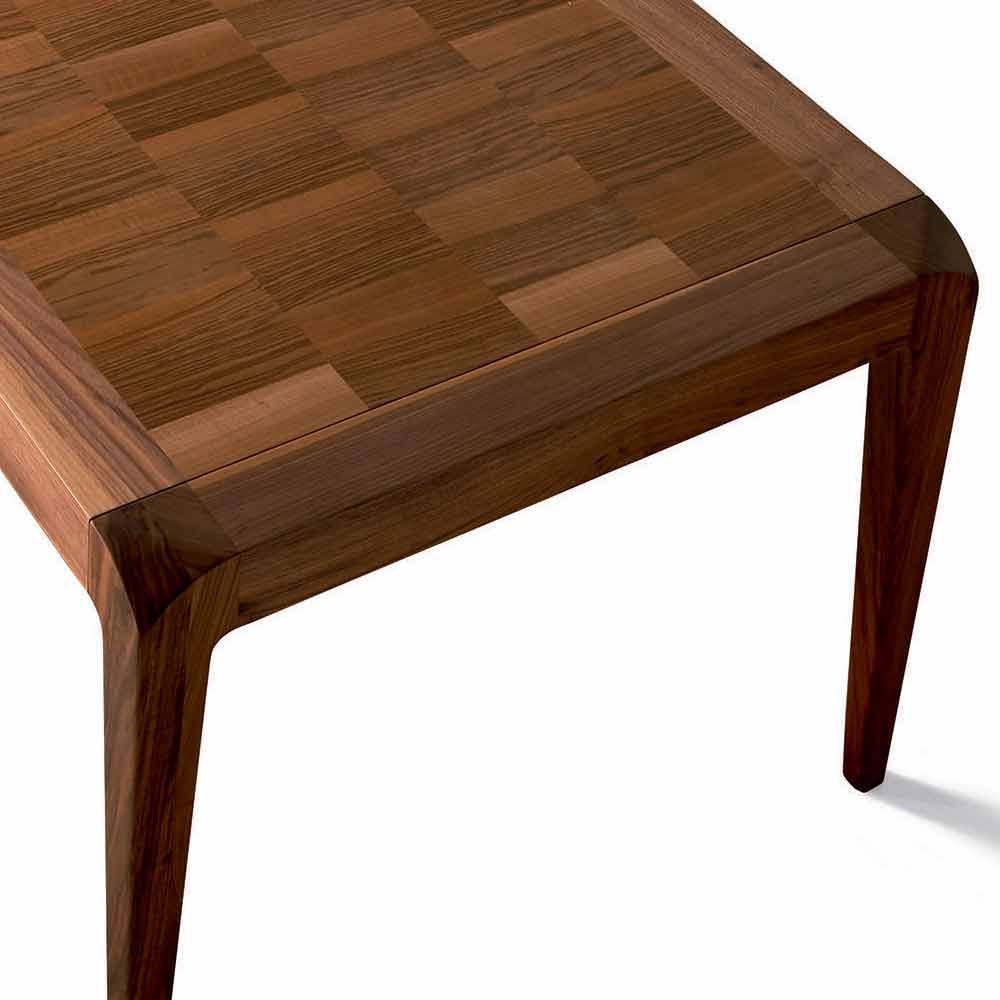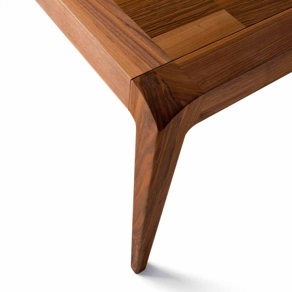 Mesa retangular extensível com tampo de madeira nogueira natural com incrustação. Estrutura e pernas em nogueira maciça. Extensões com bandas no lado inferior. A mesa destaca-se pelo processamento cuidadoso do topo, uma incrustação contemporânea que acompanha bem o movimento curvo das pernas que não criam ângulos.