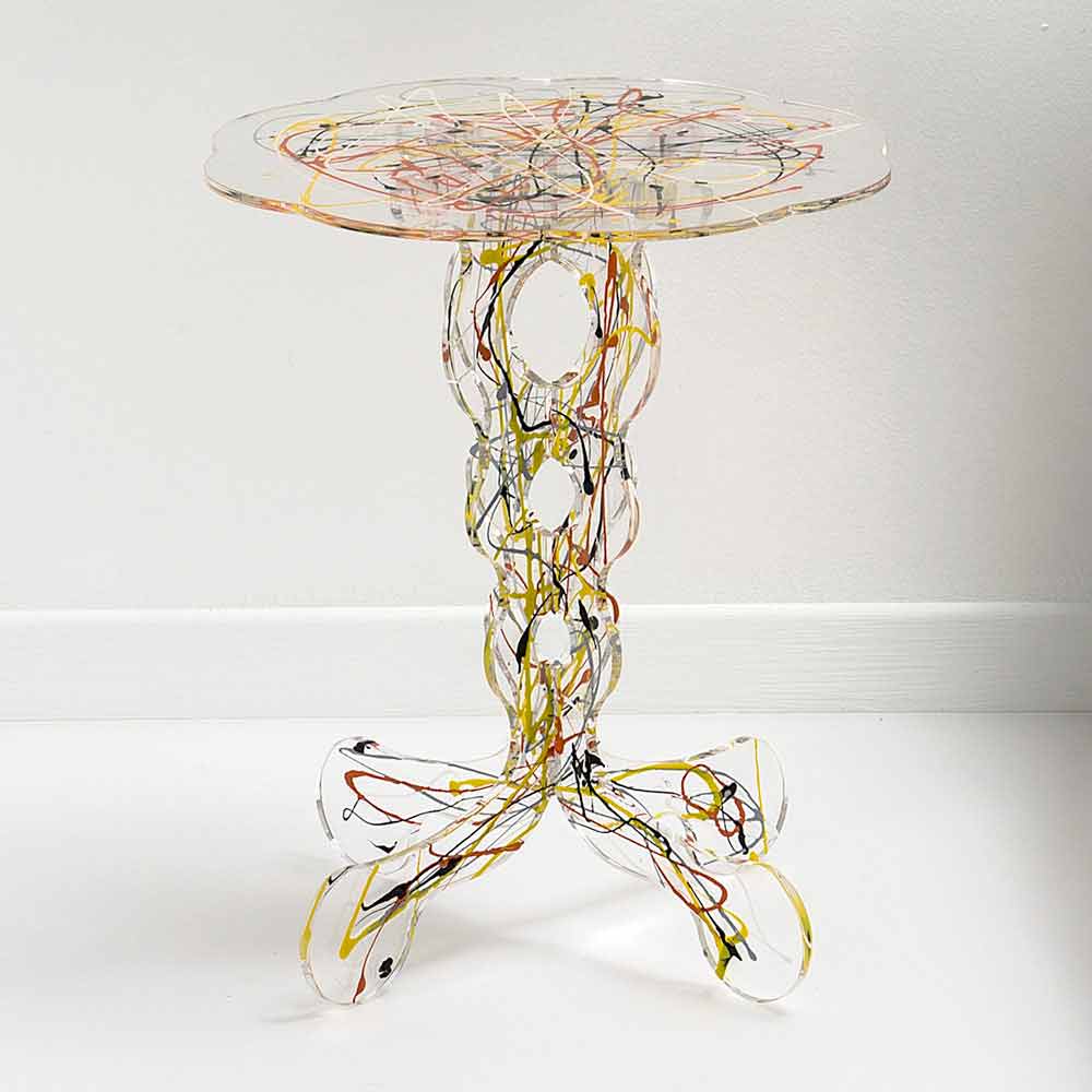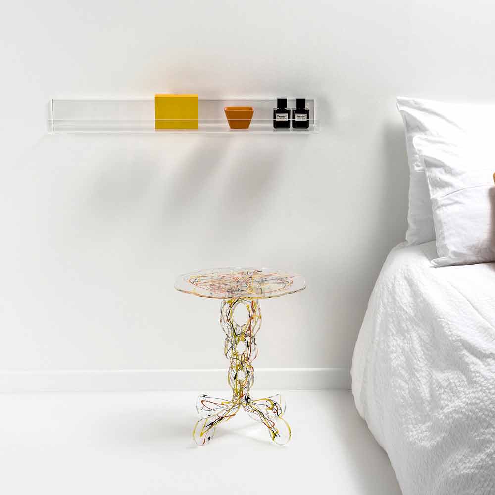 Um projeto mourisco caracteriza a mesa Janis, que pode ser usada tanto como uma mesa de café ou como uma mesa de cabeceira. A base da mesa é feita de plexiglass 100% PMMA em forma de laser. O tampo da mesa dá um toque de cor ao ambiente.