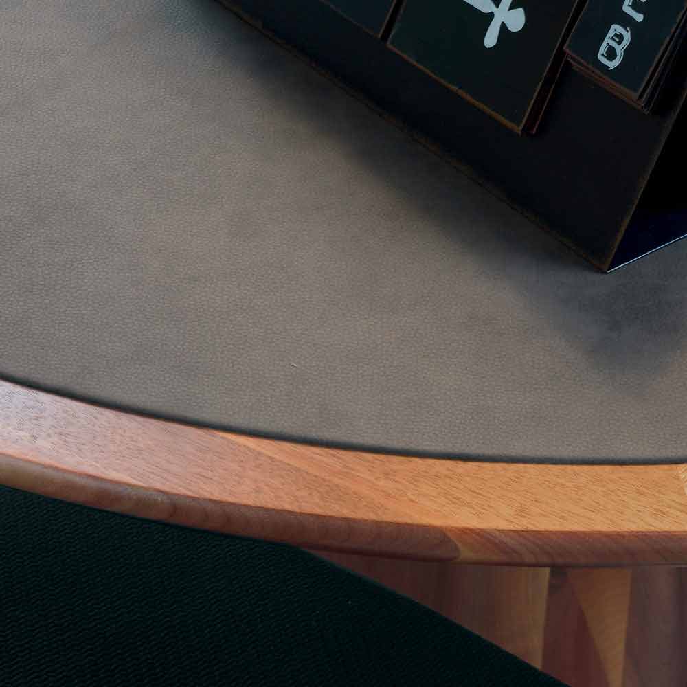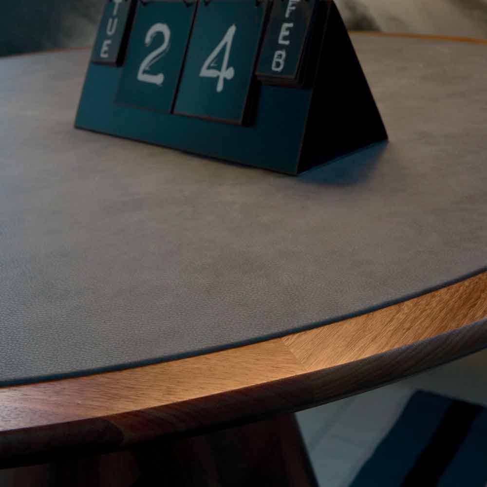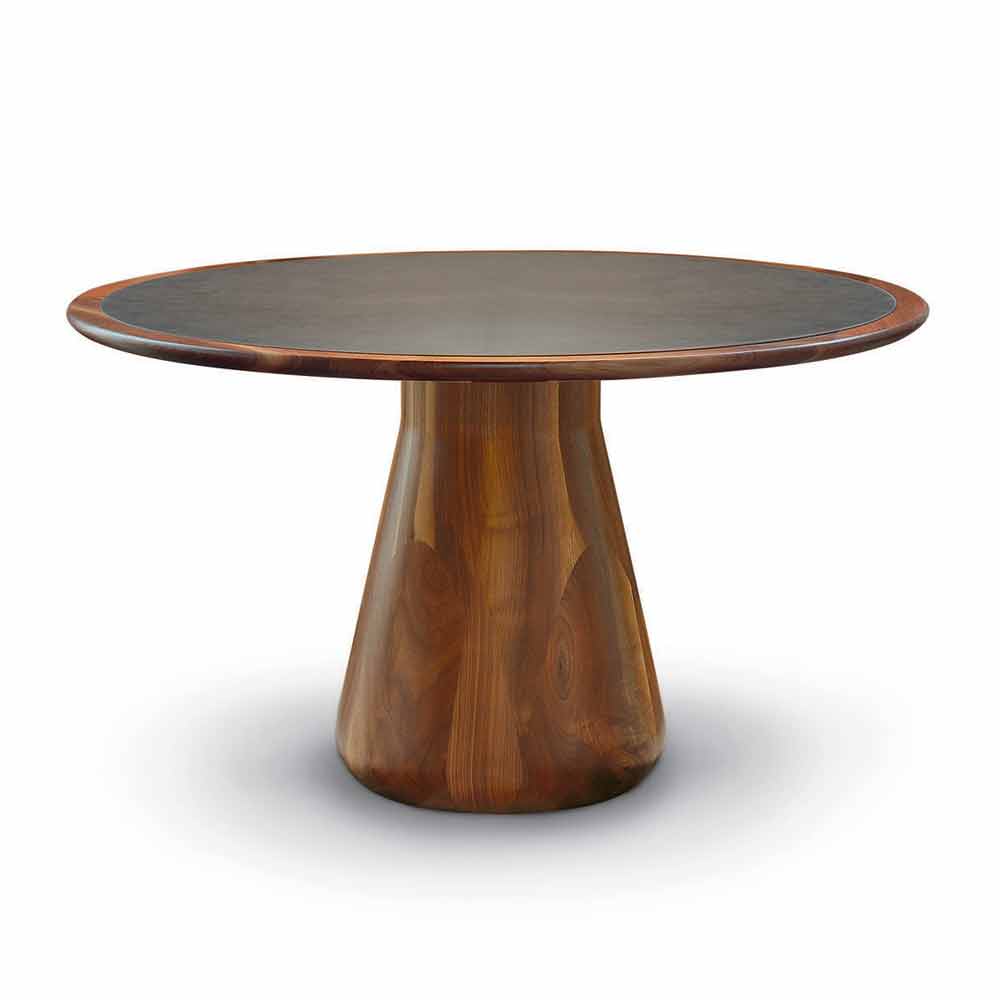Mesa redonda fixa com tampo maciço em nogueira. Base em nogueira Canaletto torneada maciça. Carlo possui traços e linhas limpas que conseguem valorizar seu valor. Fabricado em nogueira natural e com acabamento em óleo, mostra o requinte estilístico particular com o formato da base e o tampo forrado em couro ecológico.