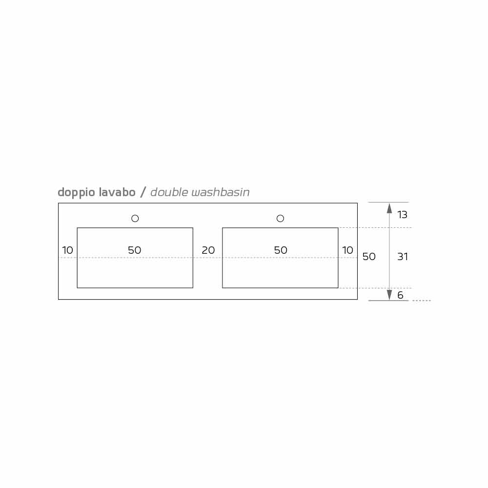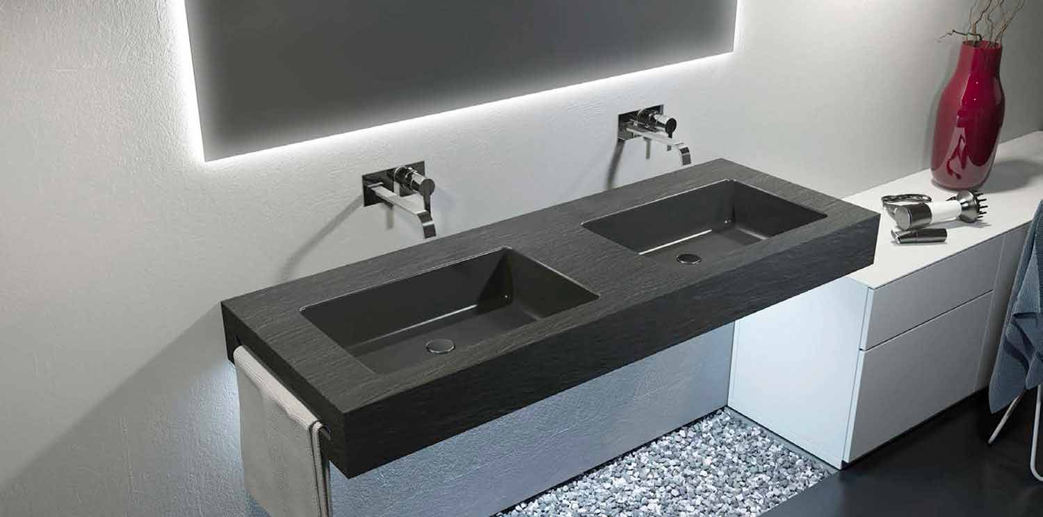 Rufina é um sistema integrado composto por um top de material que abriga dois lavatórios; Sua peculiaridade é que ele pode ser instalado em qualquer tipo de base ou ser deixado na versão suspensa.