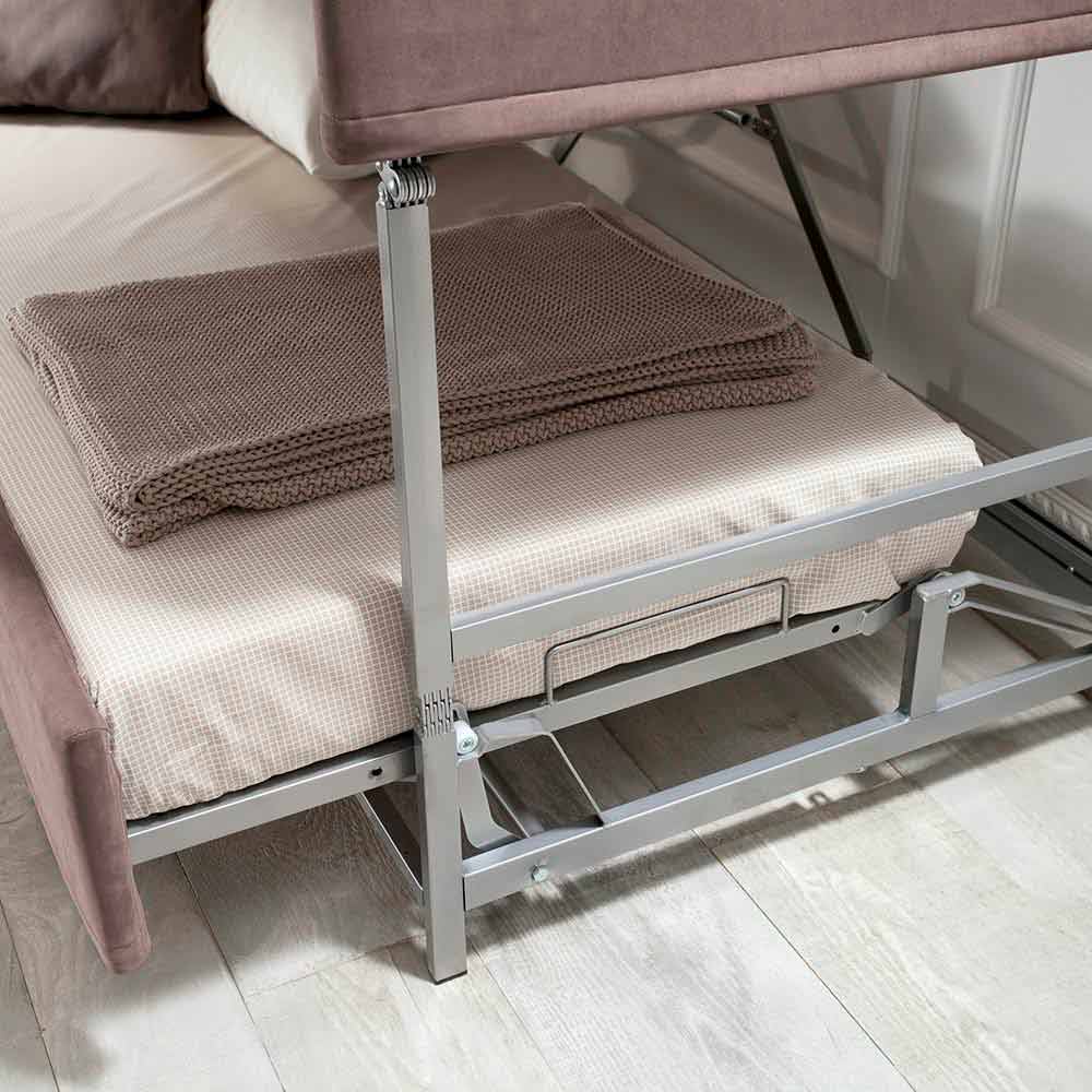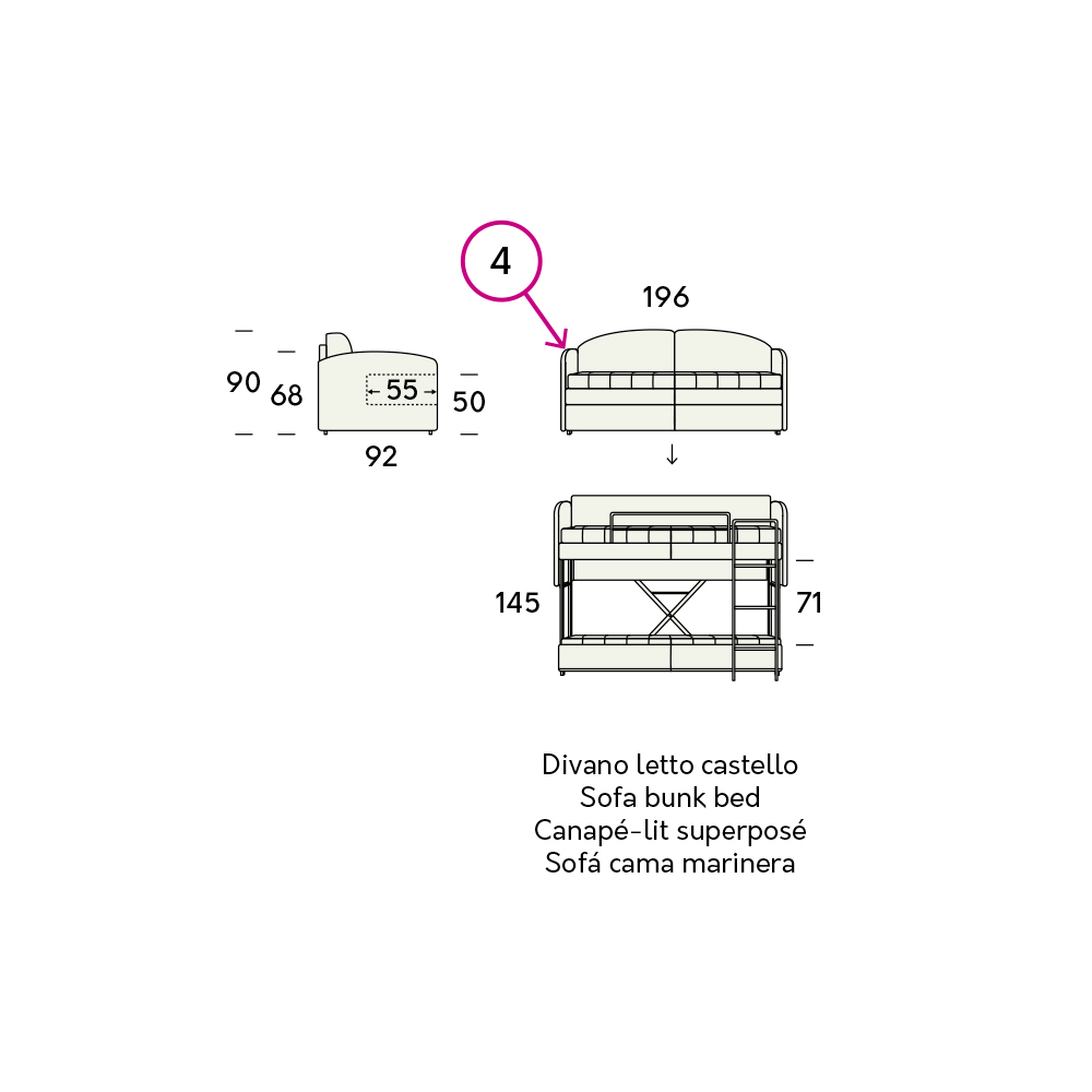 máximo conforto e tranquilidade graças ao sistema de abertura com três dispositivos de segurança que transformam a cama em sofá e vice-versa e à rede que se projeta 30 cm para facilitar e agilizar a preparação da cama de baixo. Para fechá-lo novamente, será suficiente liberar os dois suportes laterais, que permanecerão bloqueados até que o batente central também seja liberado. O sofá-cama também está equipado com uma prática escada e guarda-corpo lateral para uma garantia ainda maior de segurança.
