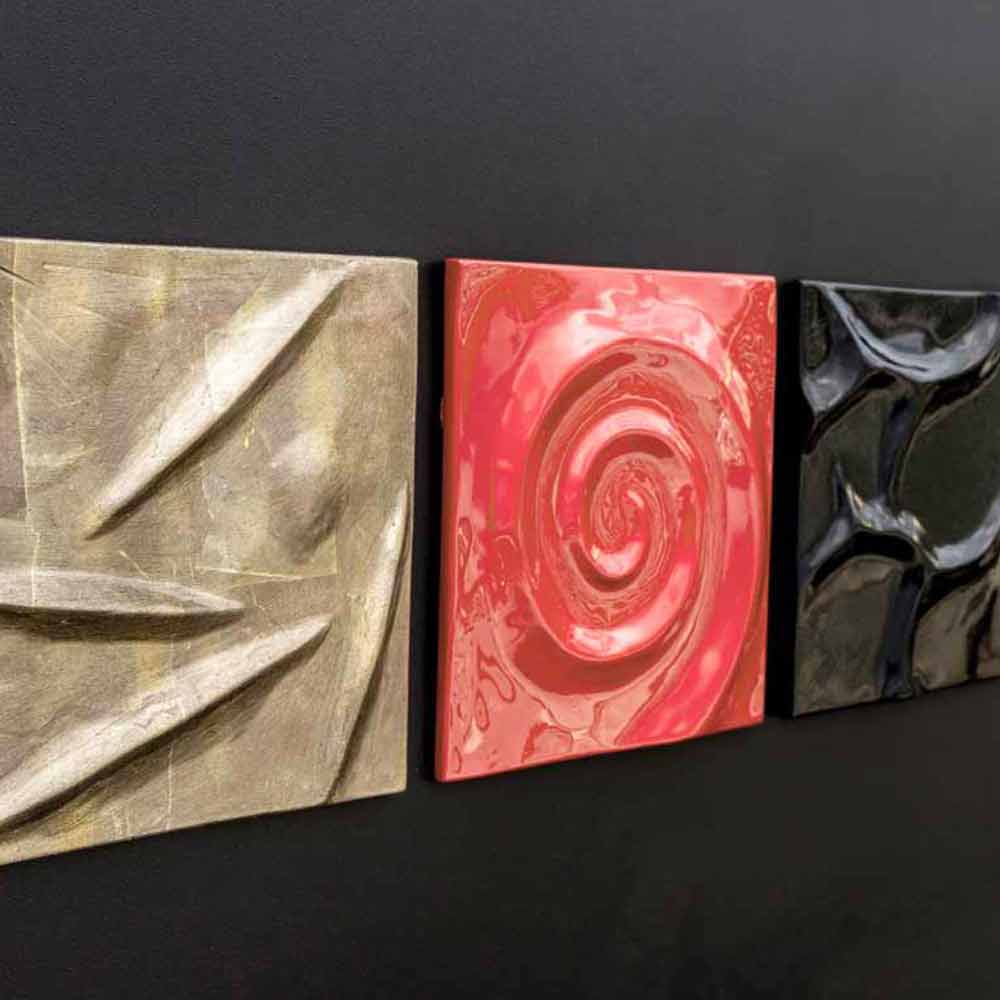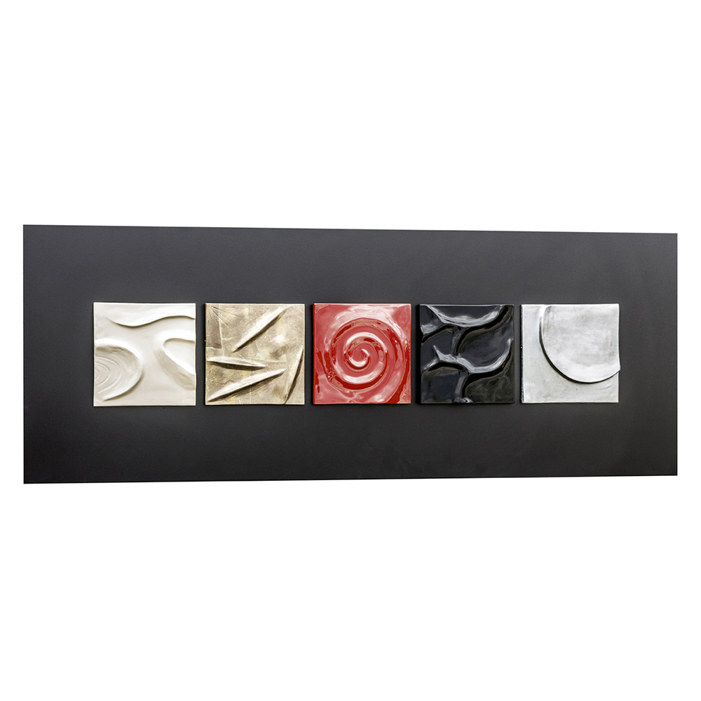 Moma é composto por cinco elementos em CMC, decorados à mão com folhas de prata e cobre. Estrutura preta sobre tela, acabamento brilhante.