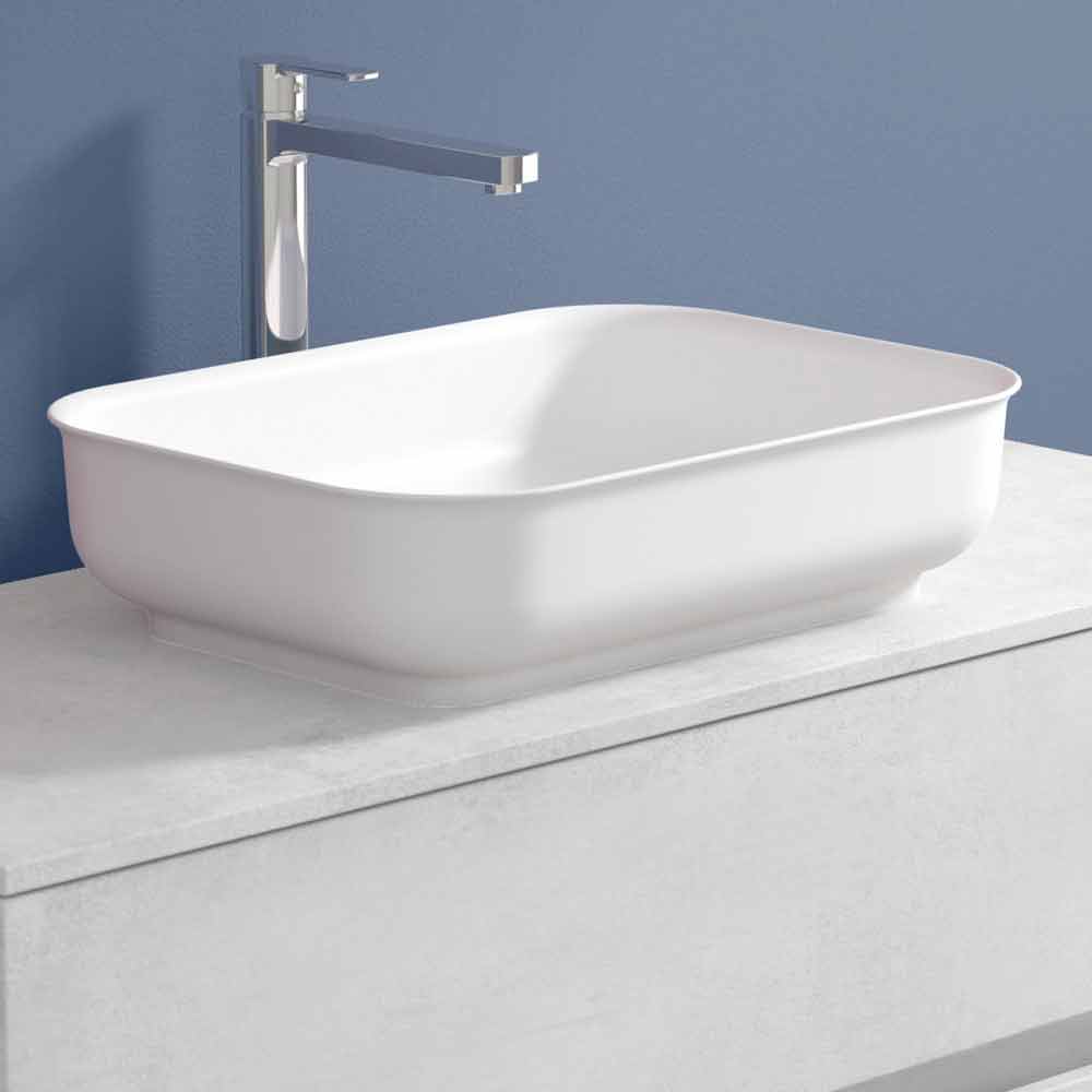 O lavatório retangular da bancada é confeccionado em Solid mate, uma resina mineral branca opaca , e com acabamento em gelcoat opaco , que torna o produto impermeável.