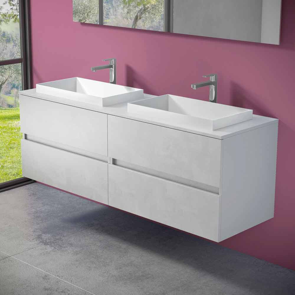 É um móvel de casa de banho suspenso com lavatório duplo embutido que se caracteriza por um design moderno e intemporal , dando especial atenção à estética e aos detalhes, bem como à praticidade e funcionalidade.