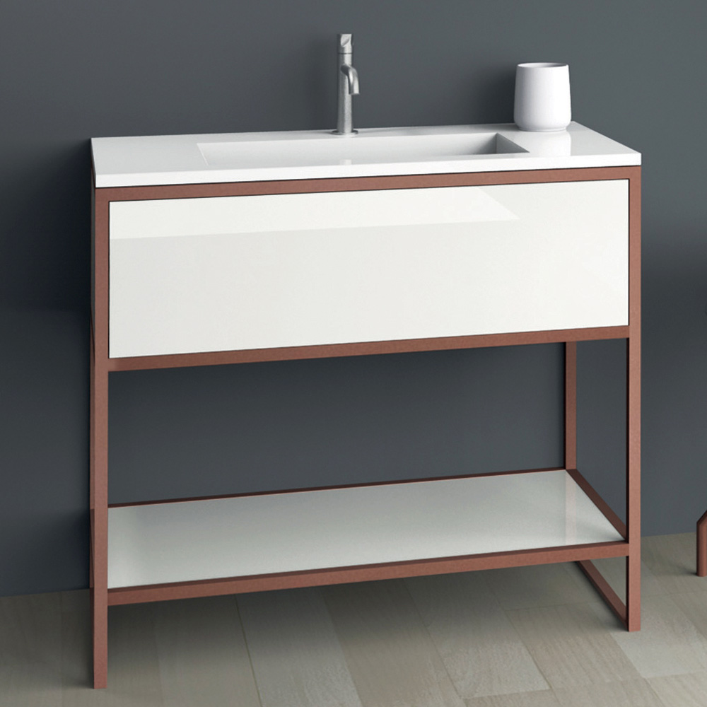 móveis de casa de banho caracteriza-se por uma estrutura em fino perfil metálico pintado de cobre acetinado que emoldura as portas e a prateleira em mdf lacado a branco brilhante, criando uma combinação harmoniosa de espaços cheios e vazios. Os acabamentos metálicos das portas destacam o