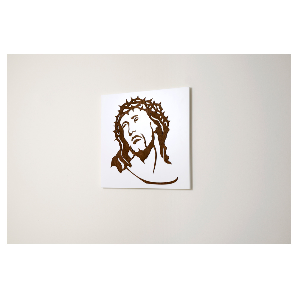 Moldura sacra em madeira lacada a branco com aplicação do rosto de Cristo em madeira wengé.