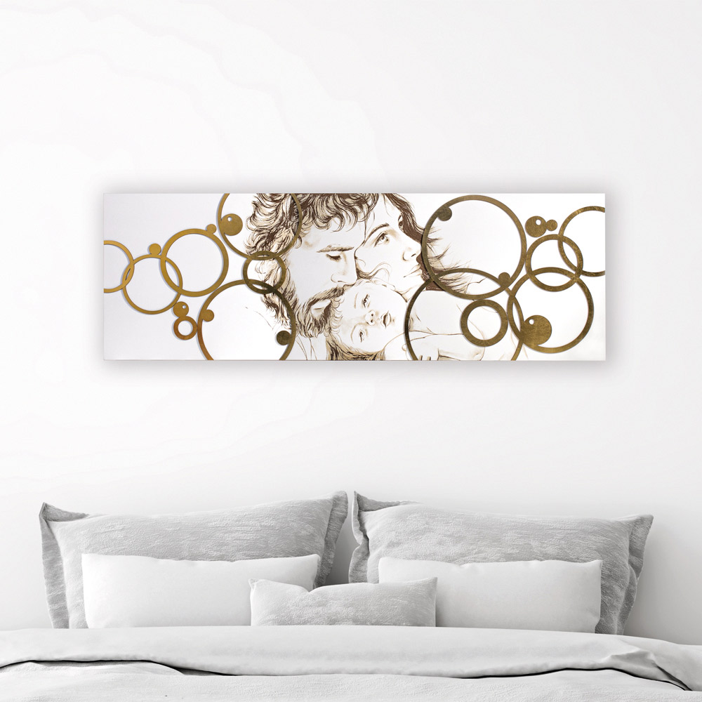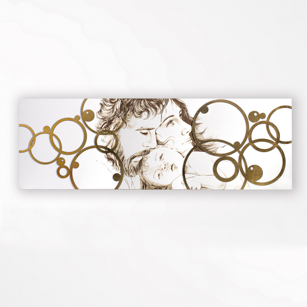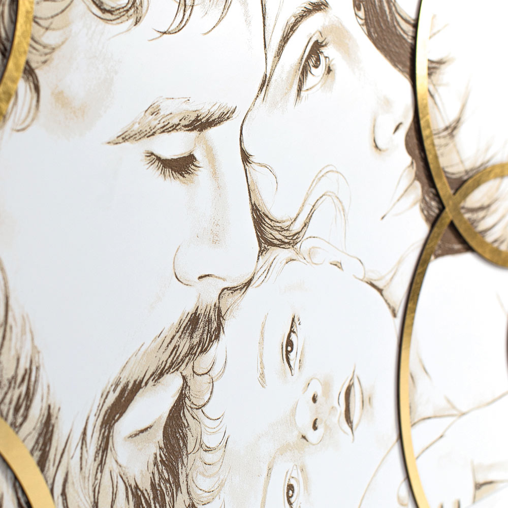 O painel representa a Sagrada Família em estilo moderno . Decorações de folha de ouro são aplicadas ao design marcado a laser. Painel de madeira lacado a branco mate com marcação a laser, técnica especial que cria um baixo-relevo nos materiais. As aplicações são feitas em folha de ouro , uma técnica especial de preciosidades.