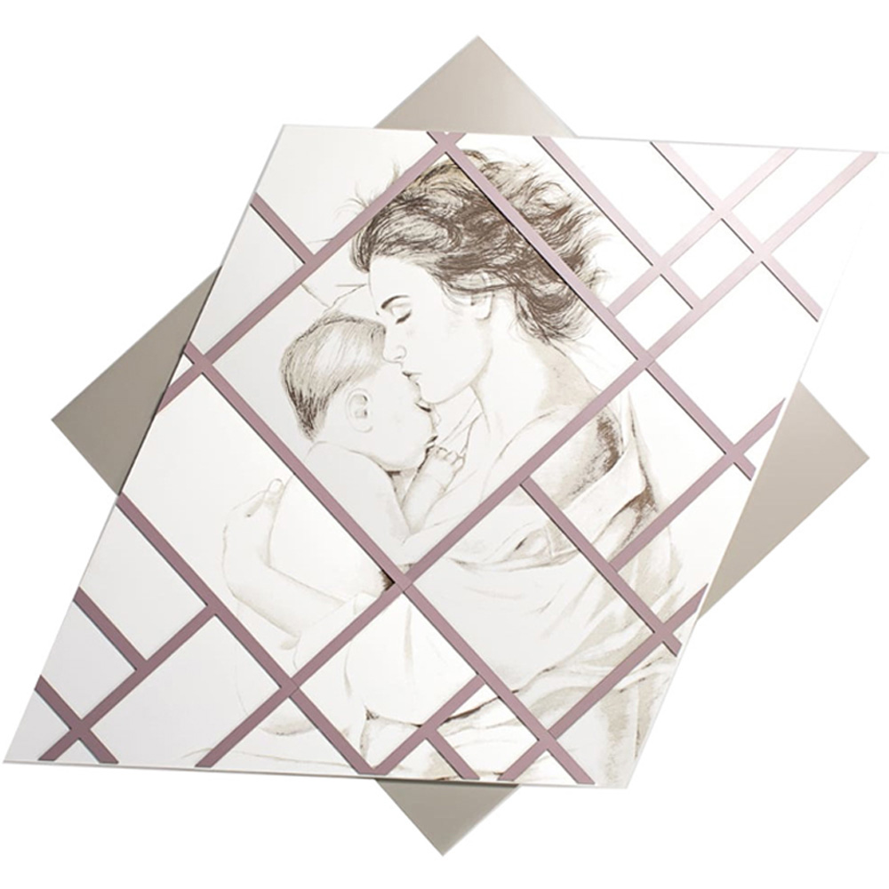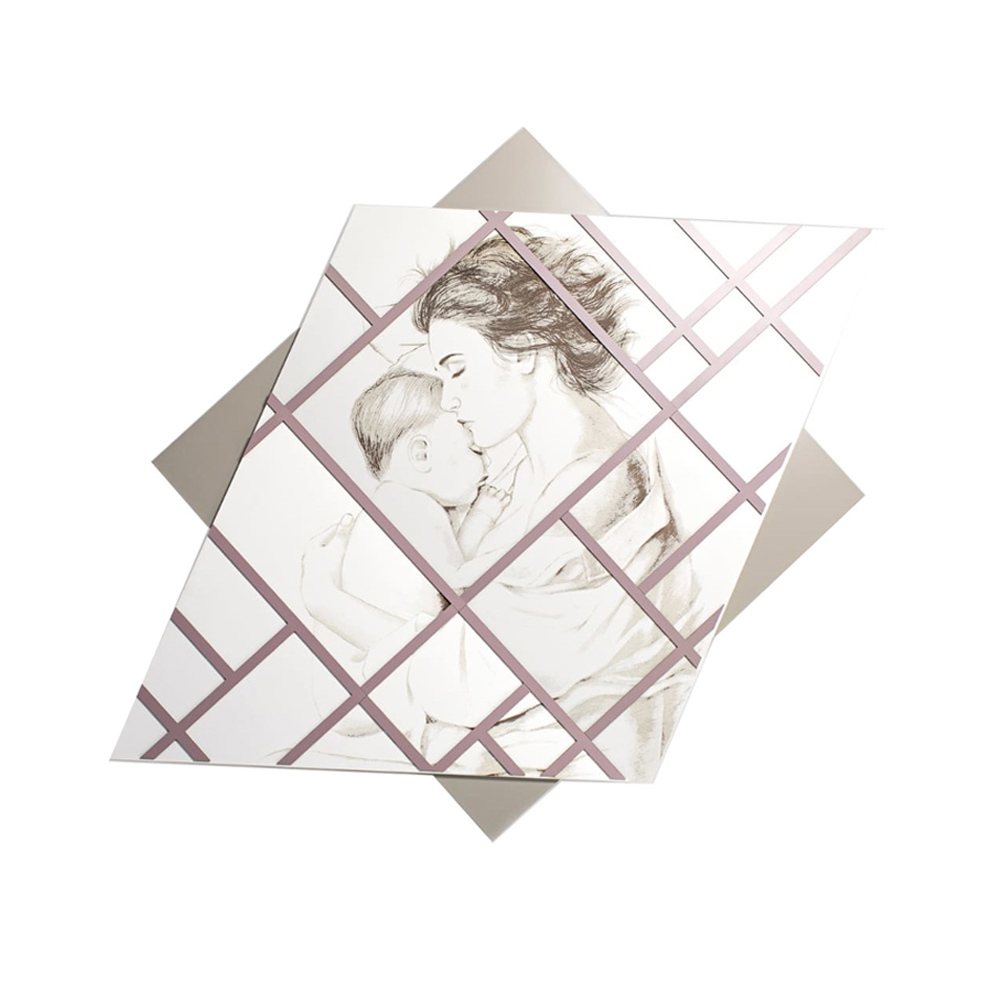 Uma cabeceira que retrata a maternidade com um abraço entre mãe e filho graças à marcação a laser, que mostra os traços dos rostos. Painel de madeira lacado a branco mate com marcação a laser, técnica especial que cria um baixo-relevo nos materiais. O painel é gravado em um painel colorido de seixos e decorado em sua escolha de veludo ou rosa cacau .
