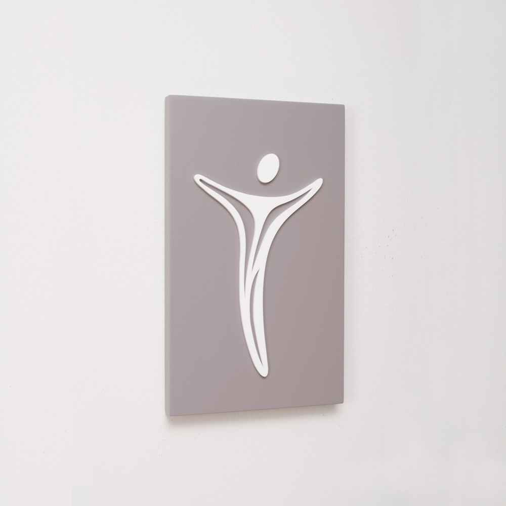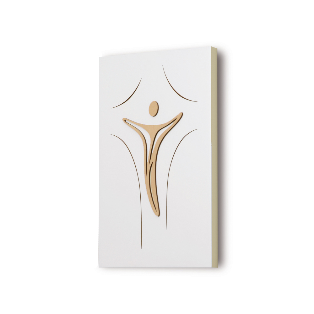 Quadro/Crucifixo com base e aplicação em madeira lacada . "Vírgulas" gravadas a laser . Furo para pendurar na parede.