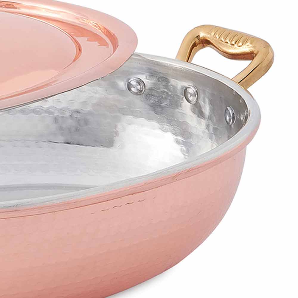 Panela oval com tampa de cobre e alças de latão, artesanalmente italiana.