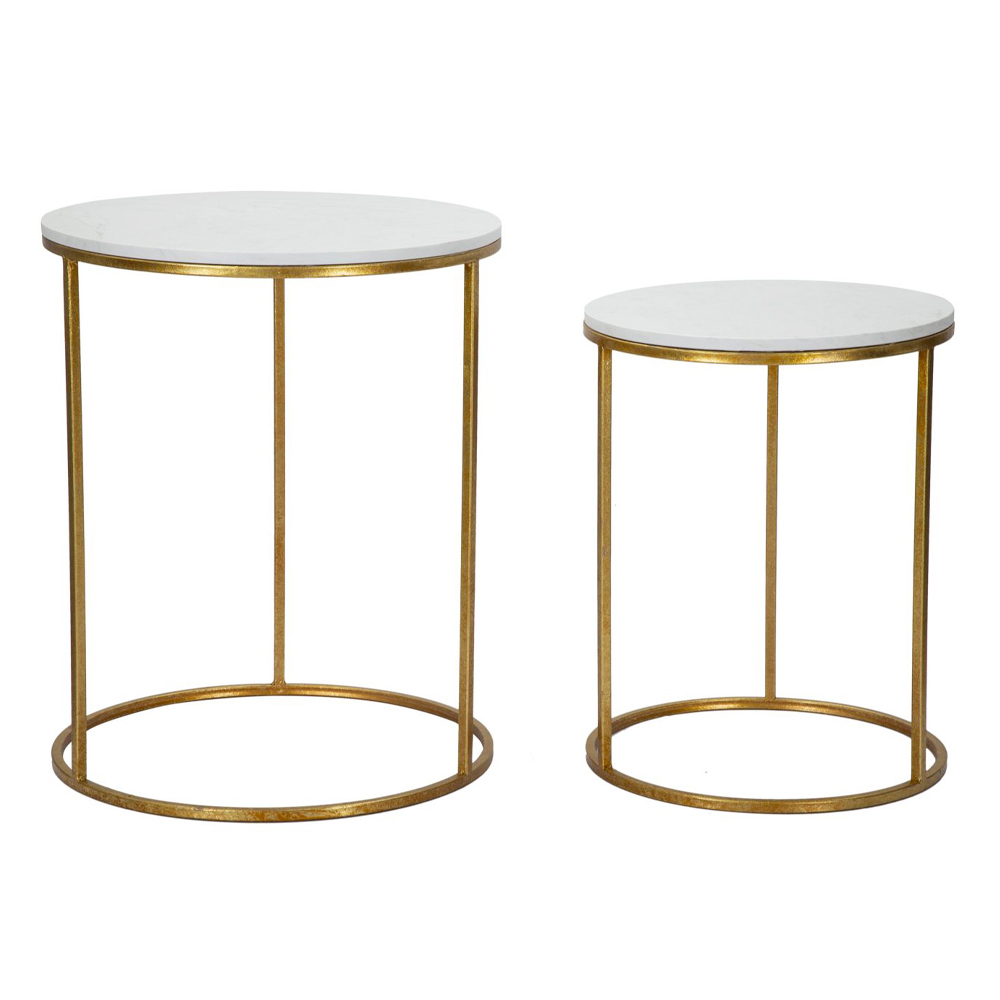 Mesas de centro com estrutura em ferro com acabamento dourado e tampo redondo em
