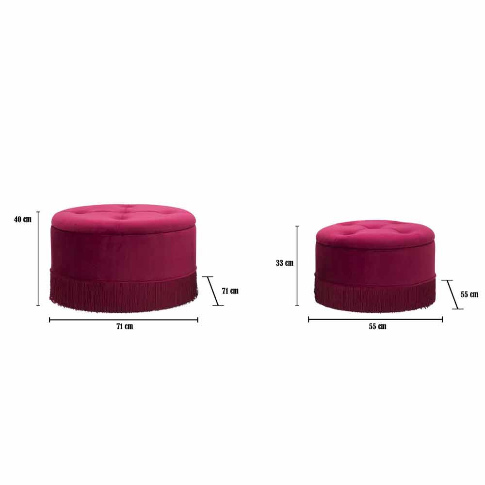 Par de pufes com recipiente cor bordô em madeira com assento de veludo de design.