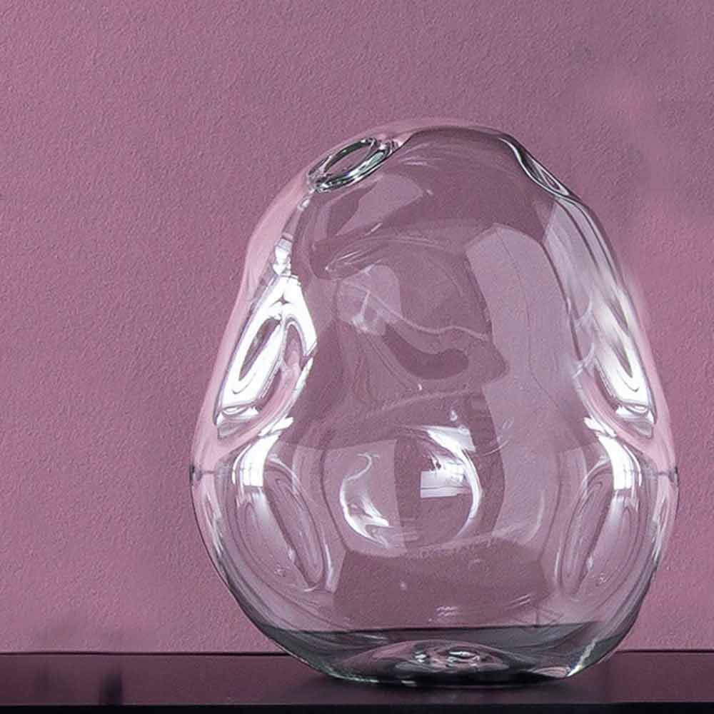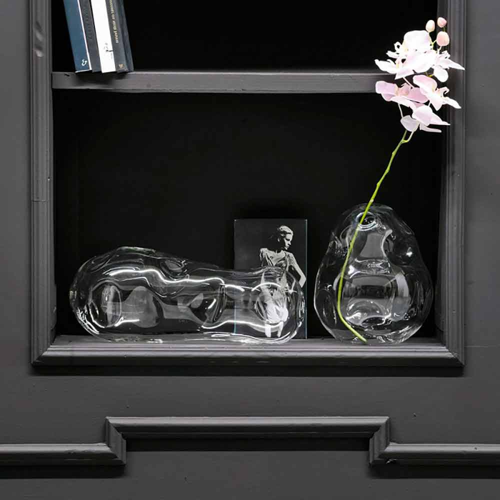 Original par de vasos decorativos feitos na Itália em vidro soprado transparente com um desenho excêntrico. Originalidade, criatividade e elegância são as características peculiares desta composição de vasos modernos que se unem para dar vida a uma