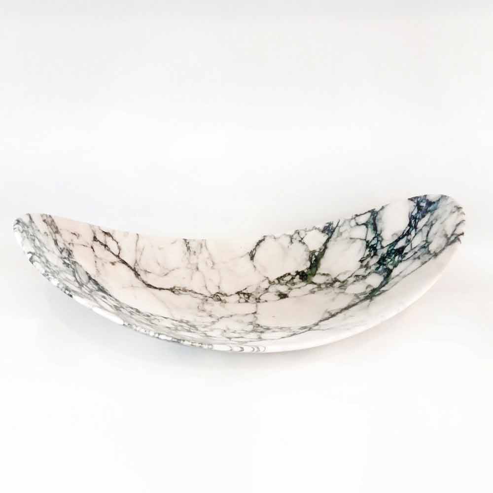 Peça central caracterizada por um design sofisticado e seu formato com linhas sinuosas e harmoniosas que conferem um visual leve e moderno ao produto. Feito na Itália à mão em mármore Paonazzo , um material compacto de grão fino com base em marfim tendendo ao amarelo bege e vermelho arroxeado com veios em tons de preto, esverdeado.