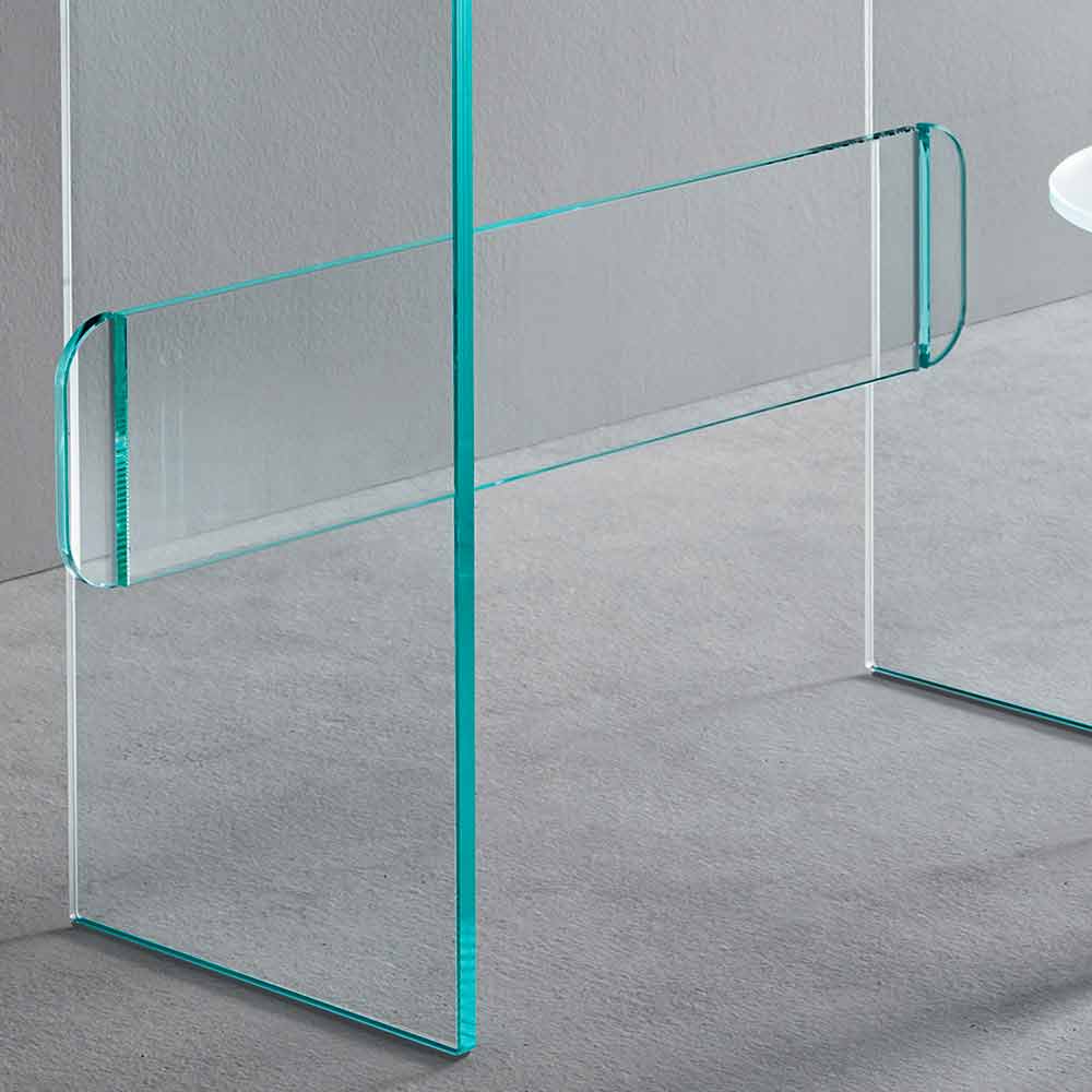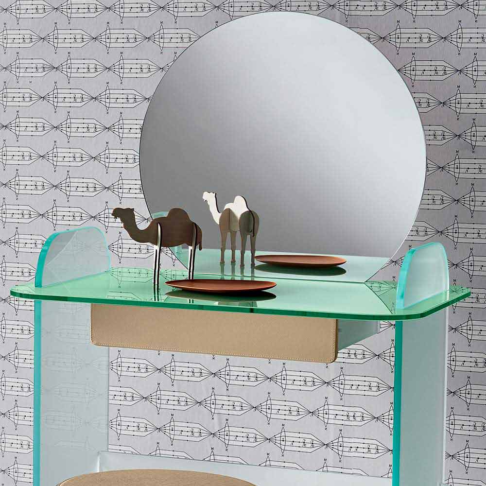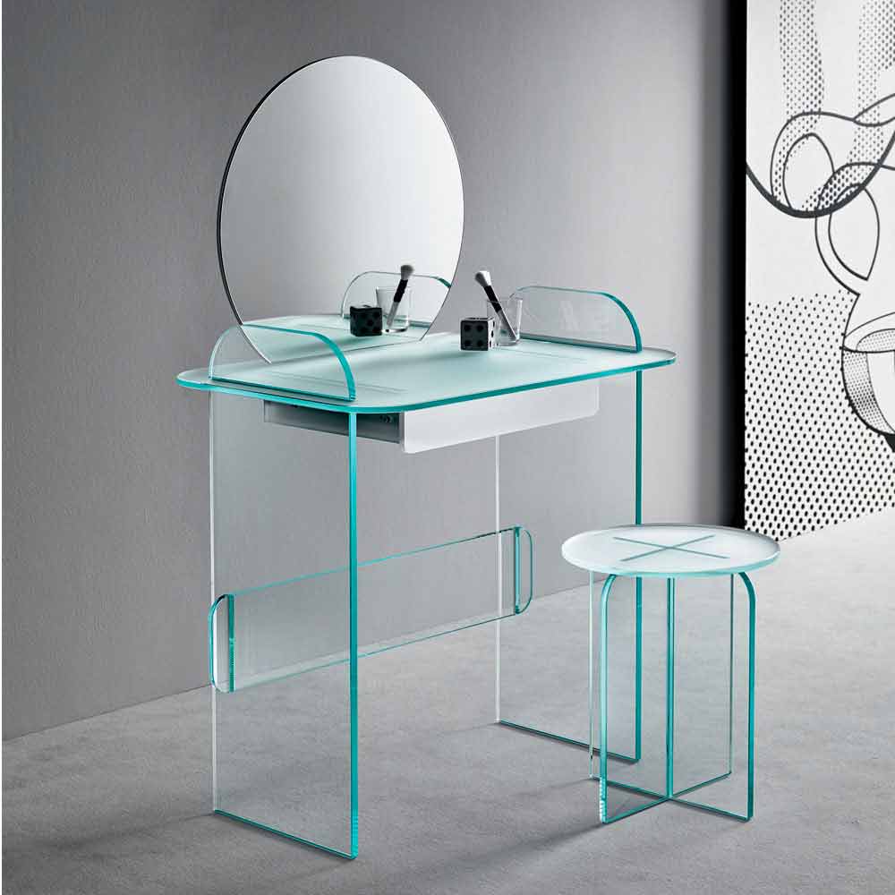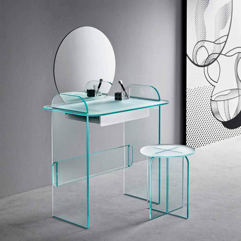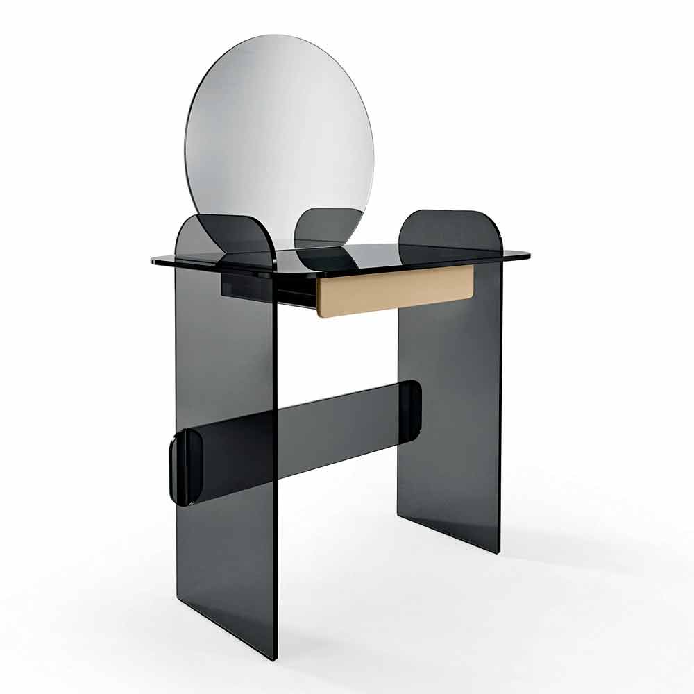 Símbolo de feminilidade e requinte, este toucador possui uma estrutura inteiramente em vidro disponível em três acabamentos e uma gaveta extraível disponível em madeira branco mate ou forrada a pele bege.