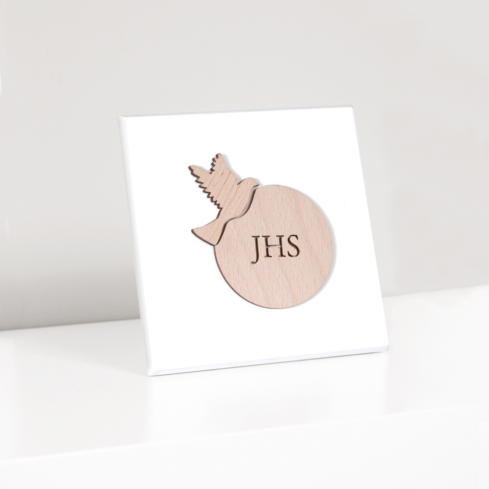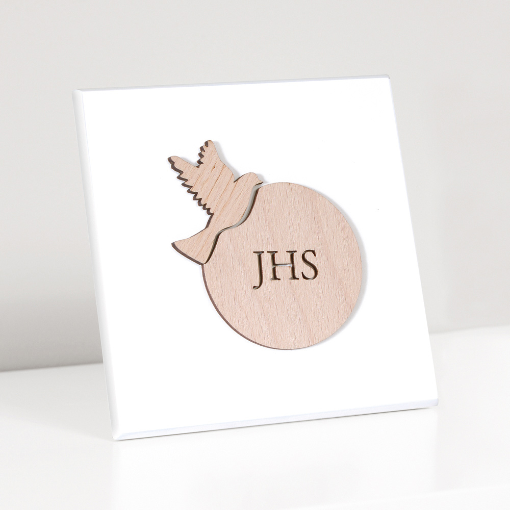 Imagem sacra com hóstia e pomba crisma em madeira natural aplicada. Painel de madeira lacado branco com pé de apoio e furo para pendurar na parede.