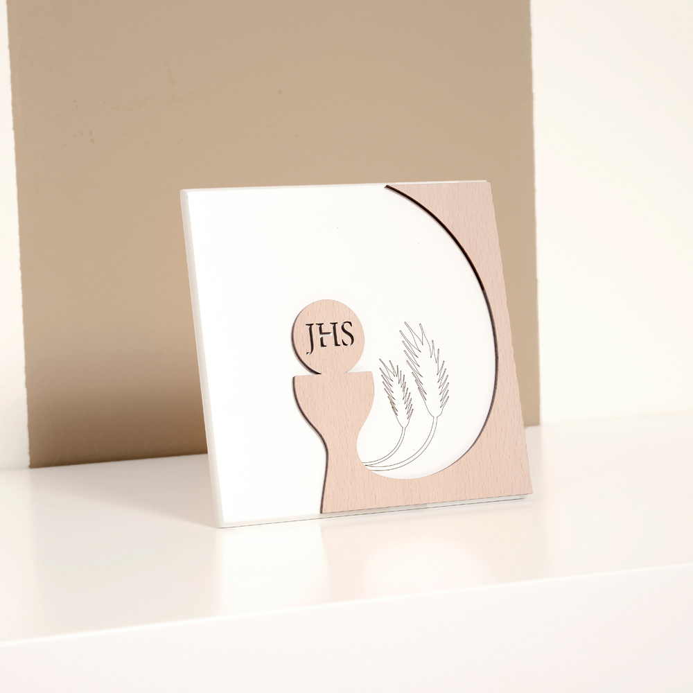 Santo quadro com símbolos de comunhão aplicados em madeira natural. Painel de madeira lacado branco com pé de apoio e furo para pendurar na parede.