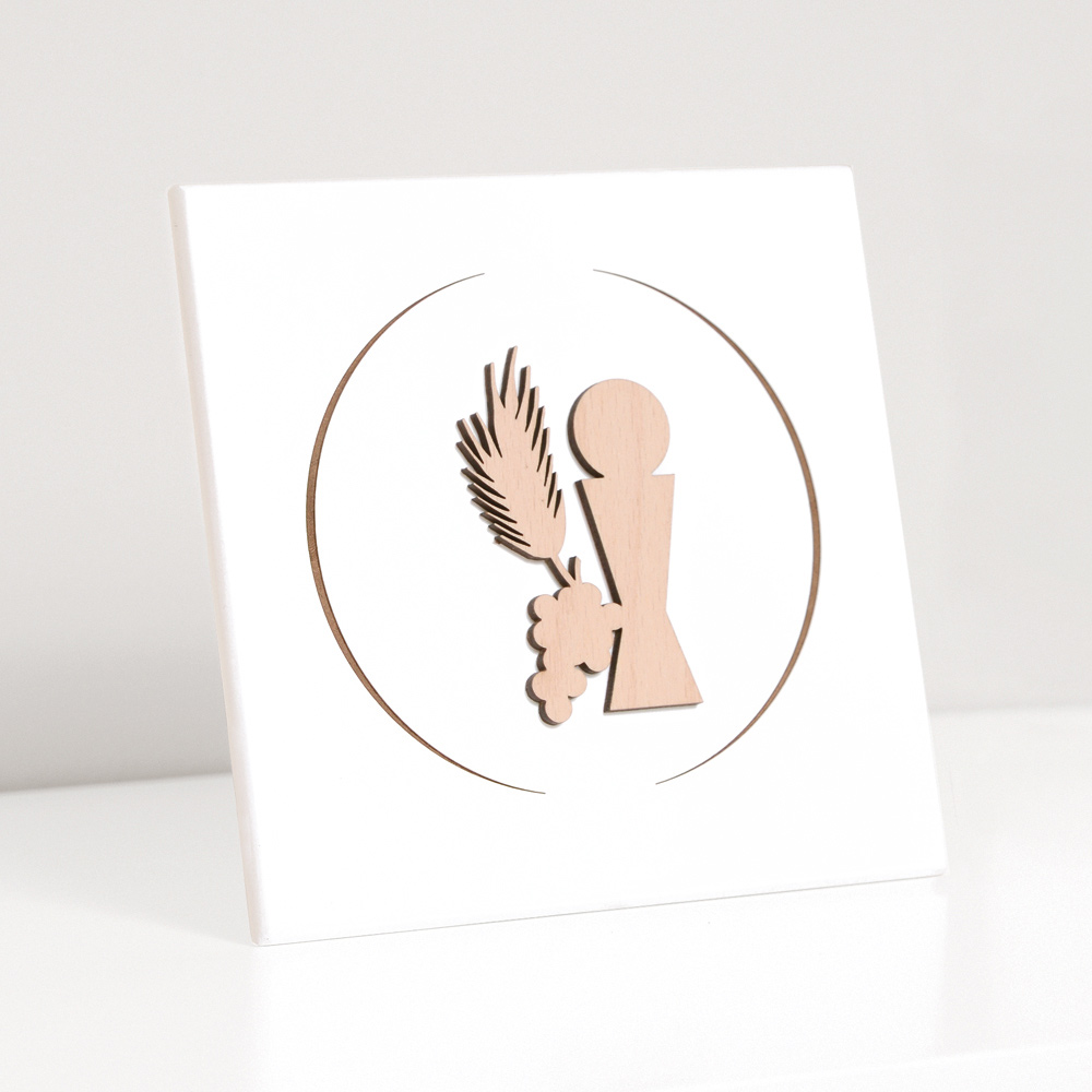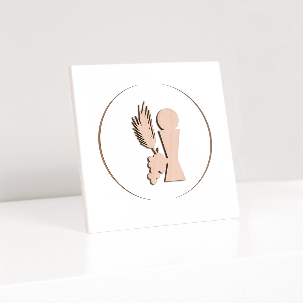 Imagem sacra com cálice da comunhão, orelha e uvas em madeira natural aplicada e gravada a laser. Painel de madeira lacado branco com pé de apoio e furo para pendurar na parede.