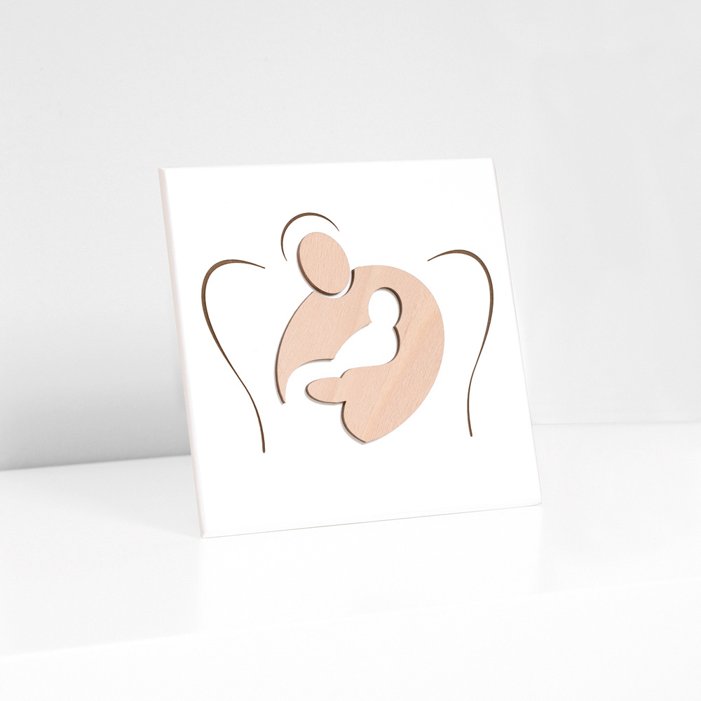 Imagem sagrada com aplicação de madeira natural de mãe abraçando filho e gravação a laser. Painel de madeira lacado branco com pé de apoio e furo para pendurar na parede.