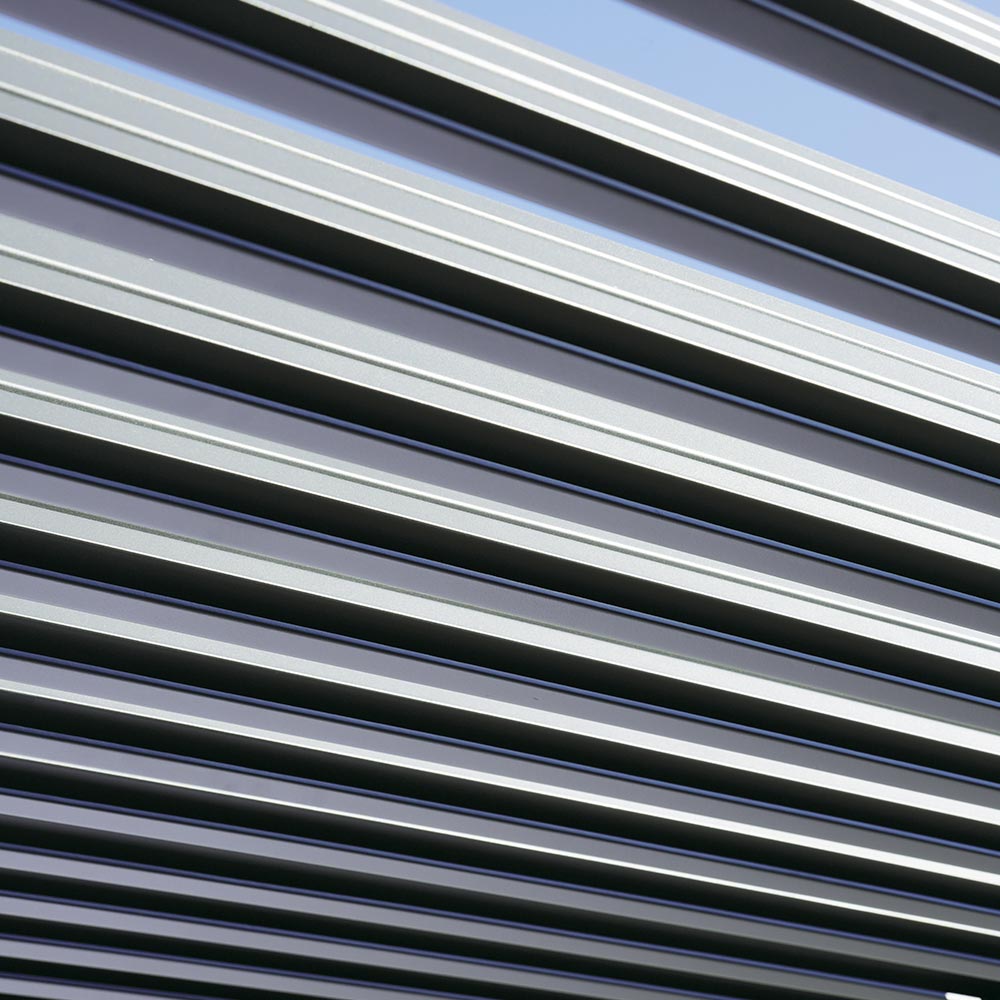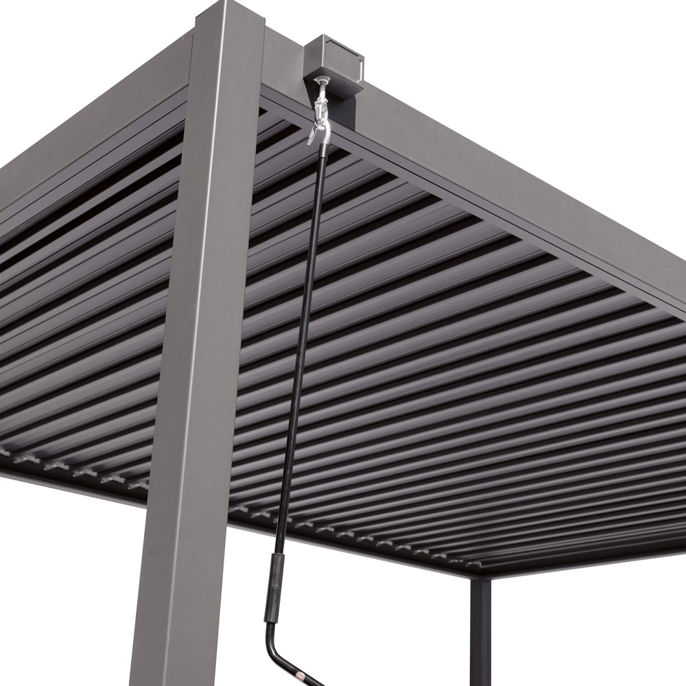 Os postes de suporte em alumínio de 90 x 90 mm e as travessas do telhado de 120 x 30 mm / 147 x 30 mm proporcionam uma estrutura sólida e confiável. O teto com venezianas ajustáveis , operado por uma manivela externa de aço , permite regular facilmente a entrada de luz e a ventilação, criando o ambiente ideal a qualquer hora do dia.