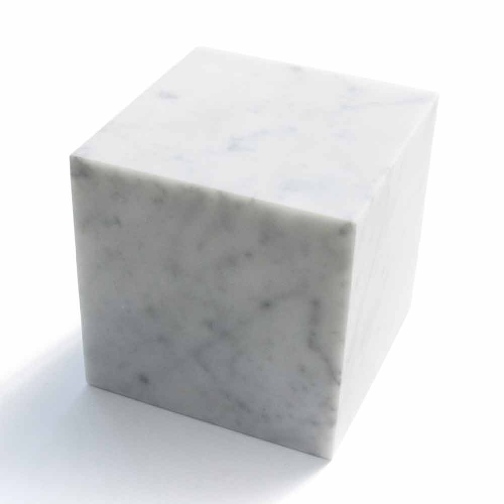 Peso de papel cubo feito de mármore de Carrara branco . É uma peça única, pois cada bloco de mármore utilizado difere dos demais pelos veios e tonalidades graças ao trabalho artesanal de profissionais especializados no processamento do mármore.